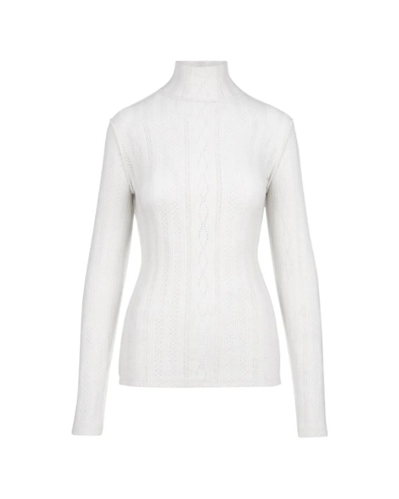 Smythe close fitting versatile turtleneck with striking white pointelle knit ends at the hip and features reverse seaming details.