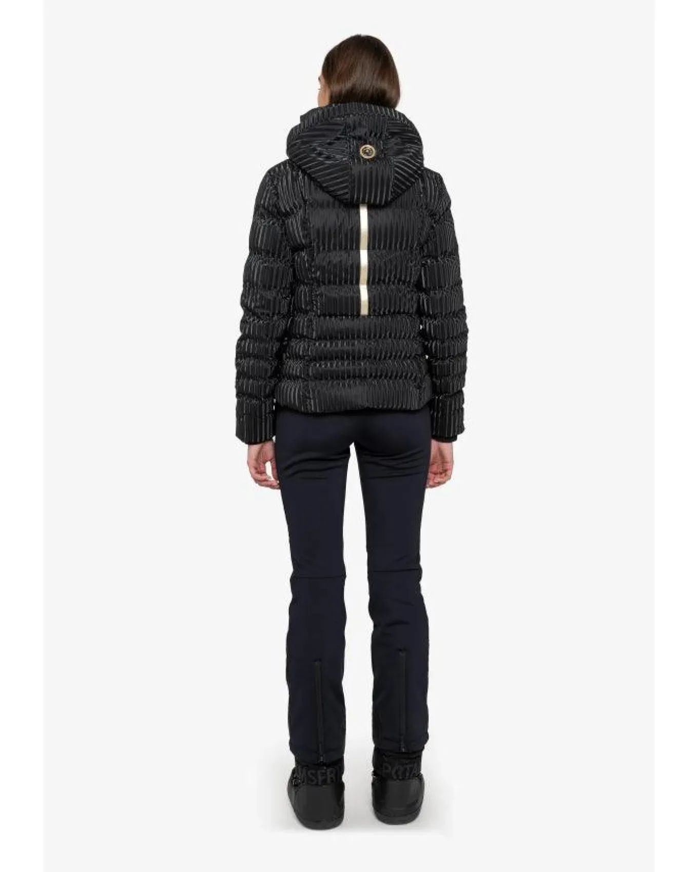 Sportalm striking high quality down jacket with pleat effect, small zip pocket on the left upper arm, two-way zip in the center front and zip pockets emphasize functionality and dynamic style, zip-off hood, metallic band in the center back for modern touch. With a wind guard and a practical zip pocket inside. Size 36 – Back Length 63 cm.