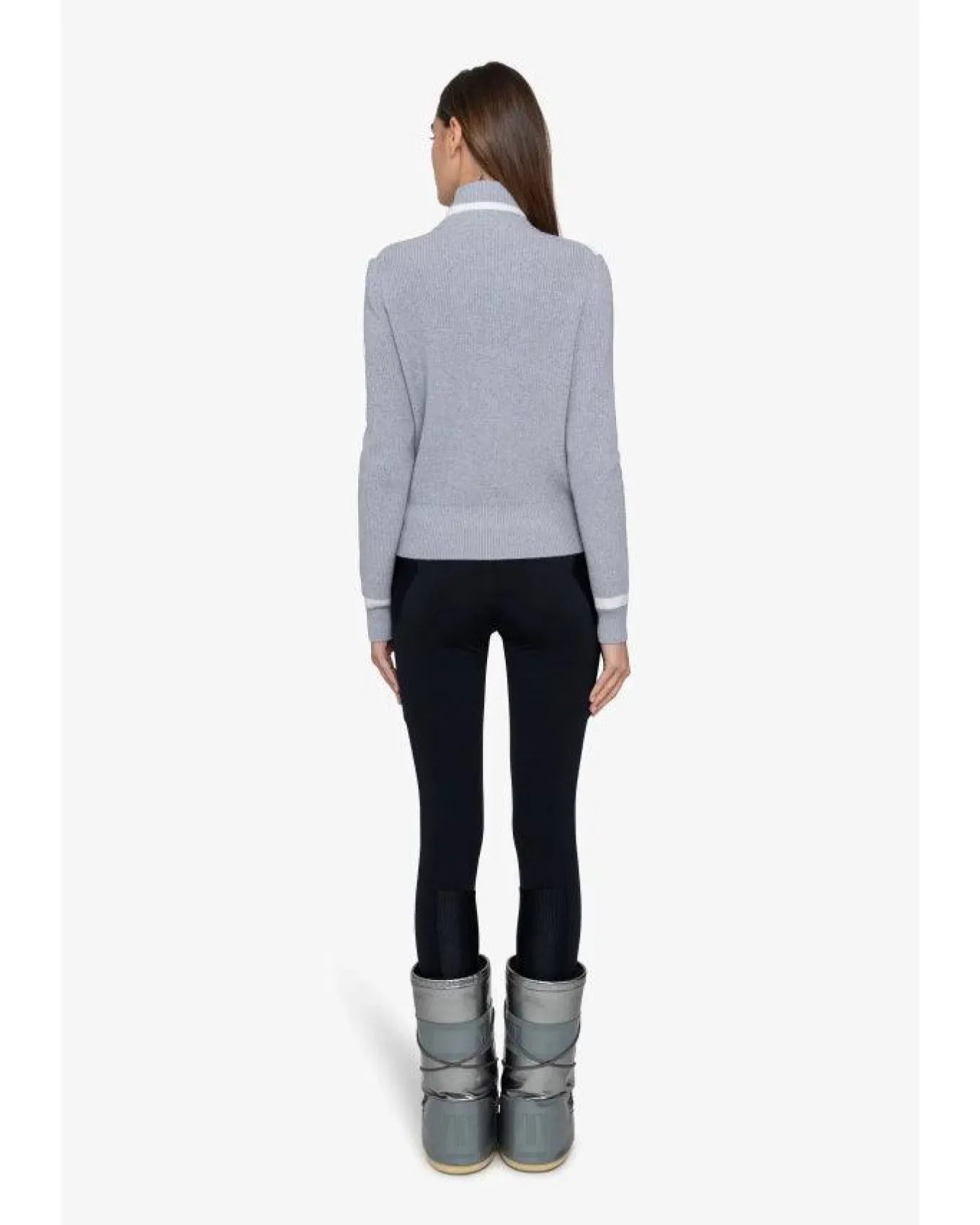 Sportalm impressive sporty rib knit bomber style cardigan with shiny nylon front is softly padded and decorated with abstract zigzag quilting, zip pockets, two-way zip in the front complements the design. The turtleneck in wide rib is decorated with a wide contrasting stripe, while the sleeves in sporty rib with cuffs and contrasting stripes ensure a dynamic look. Size 36 – Back Length 55.0 cm.