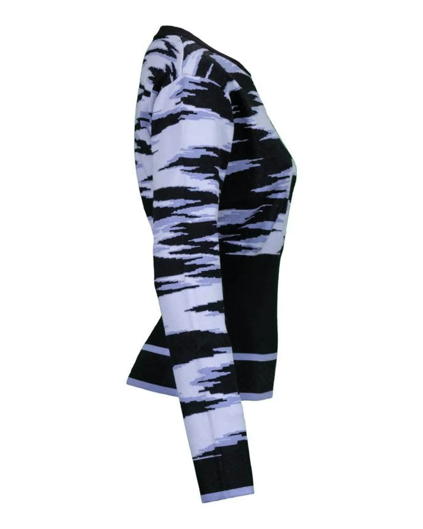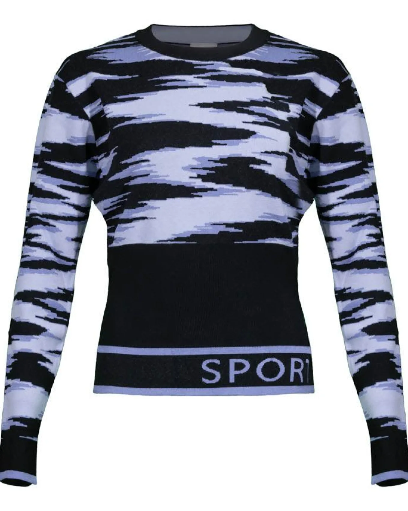 Sportalm combination of matt viscose and elastane knit three color graphic moiré jacquard print pullover with round neck and a high, plain flat ribbed waistband and a contrasting stripe with Sportalm logo jacquard on the hem add stylish accents.