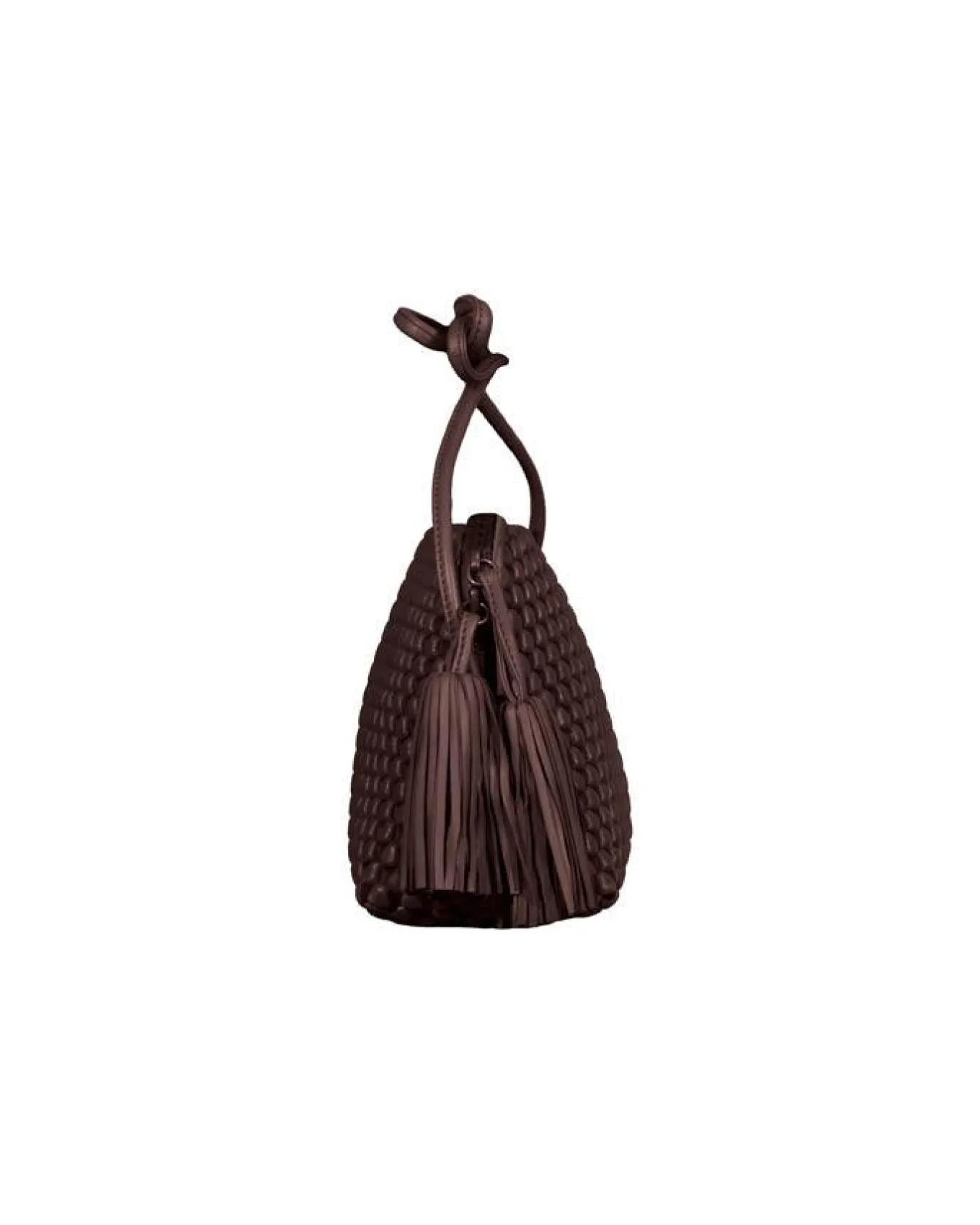 Tissa Fontaneda compact cross body nappa bubble handbag with double tassle zip closure, one interior pocket, leather woven handles and cotton lining. Handcrafted by skilled artisan using the the finest, velvety soft nappa bubble lambskin. Dimensions: Height: 15cm, Width: 21cm, Depth: 10cm.