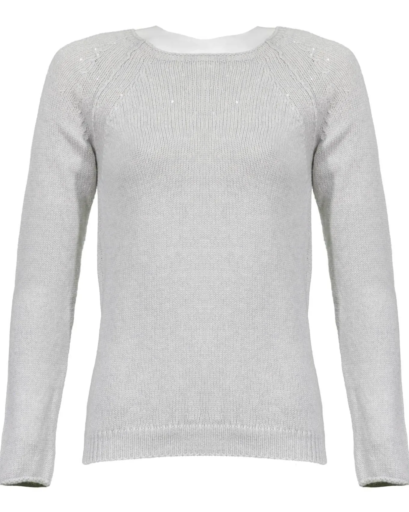 Semi-fitted long sleeve knit wool blend pullover with slight contrast detailing around necklineand a hint of sparkle