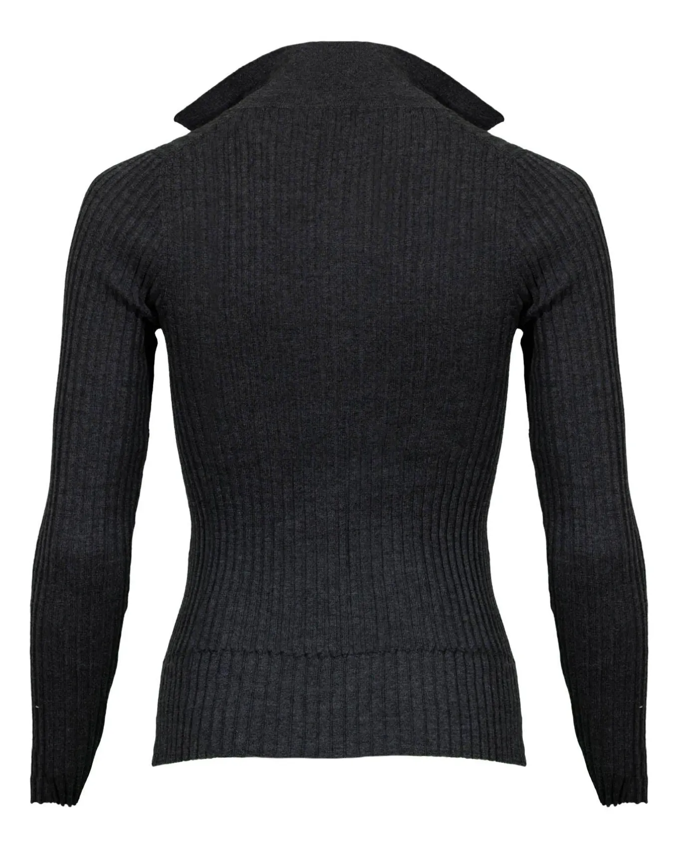 Fitted rib knit merino wool long sleeve polo style pullover with v-neck and side hem slits