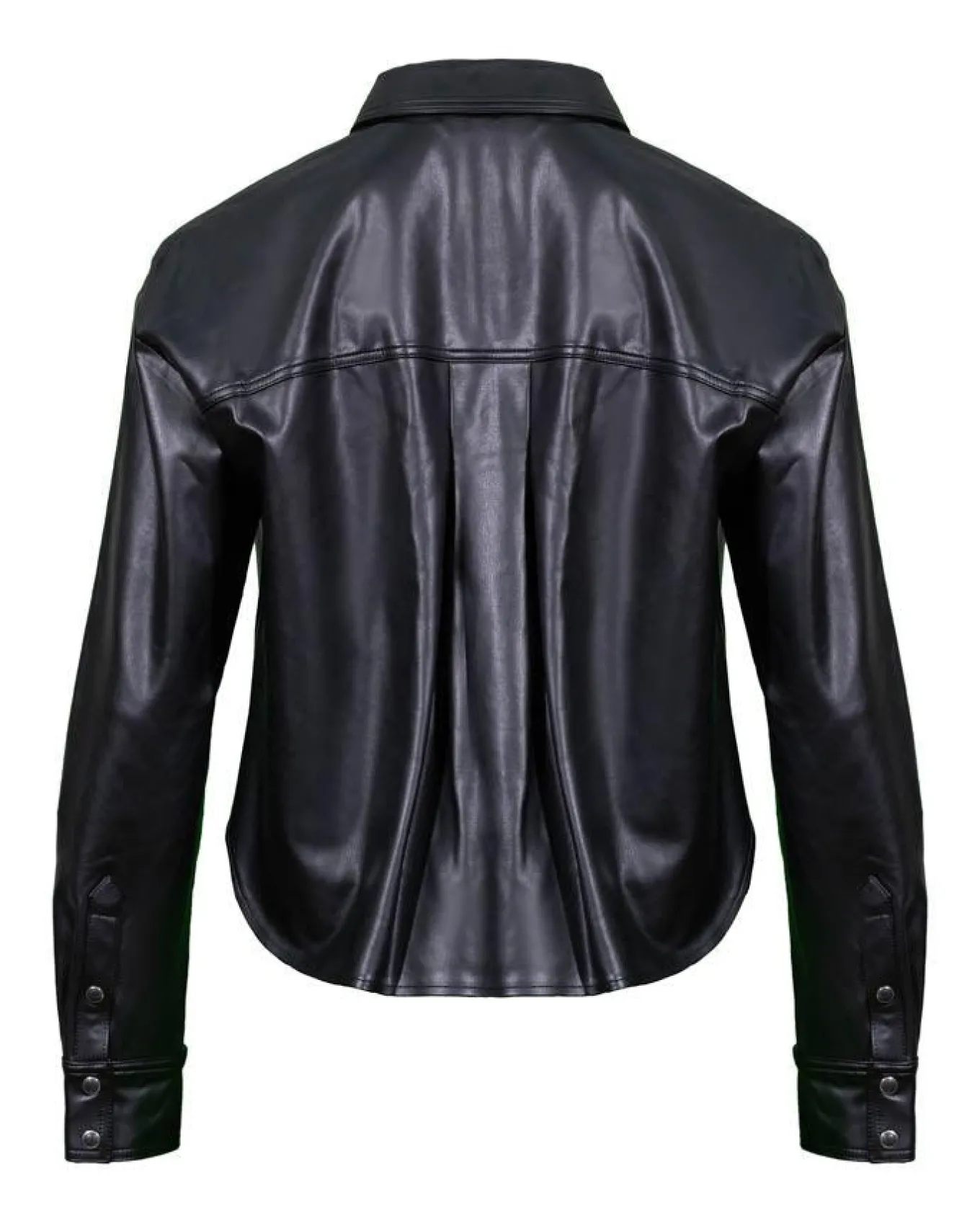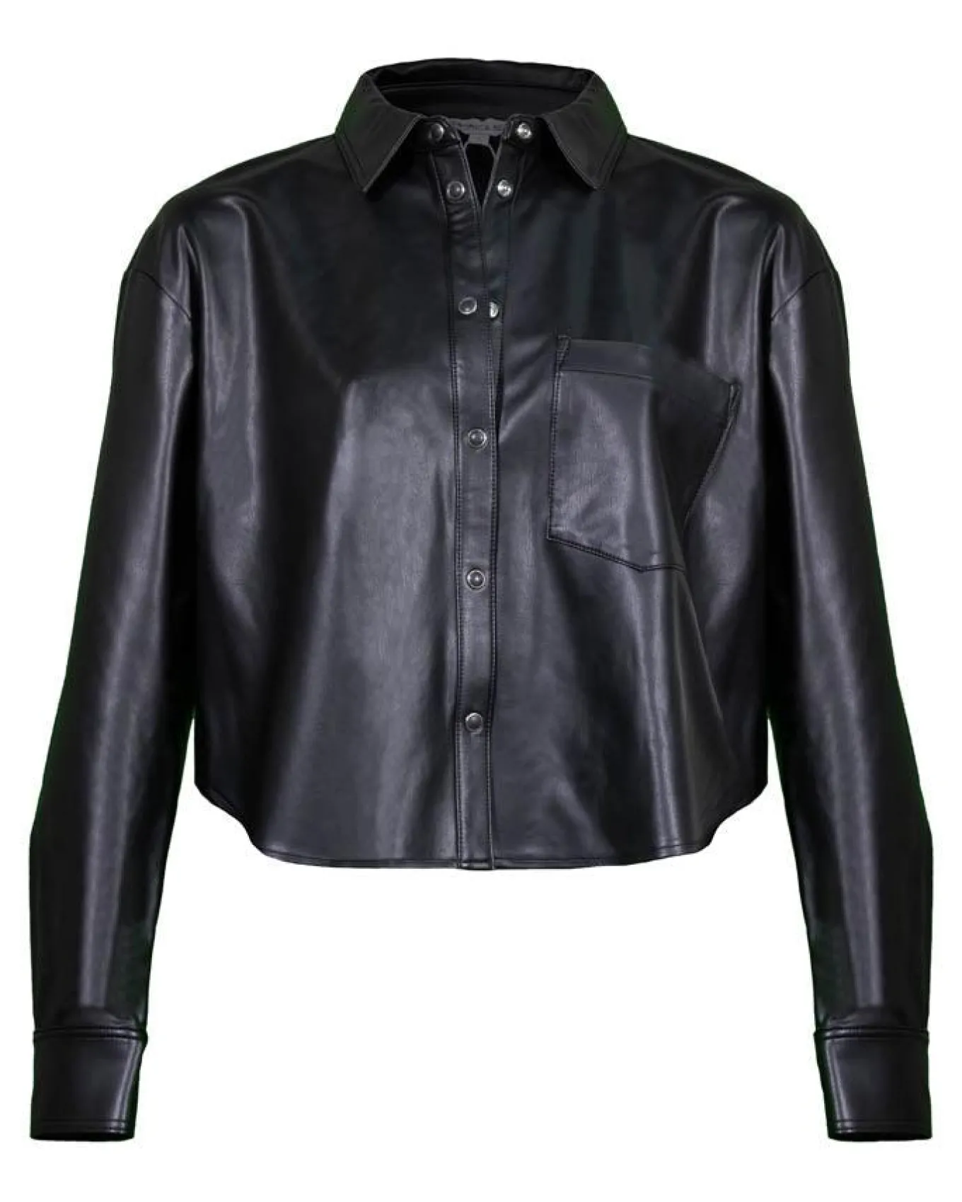 Veronica Beard cropped stretch faux leather shirt-jacket with snap button placket, chest patch pocket, drop shoulders, back yoke, rounded hem and relaxed fit. Size 2 -Length 22.25″.