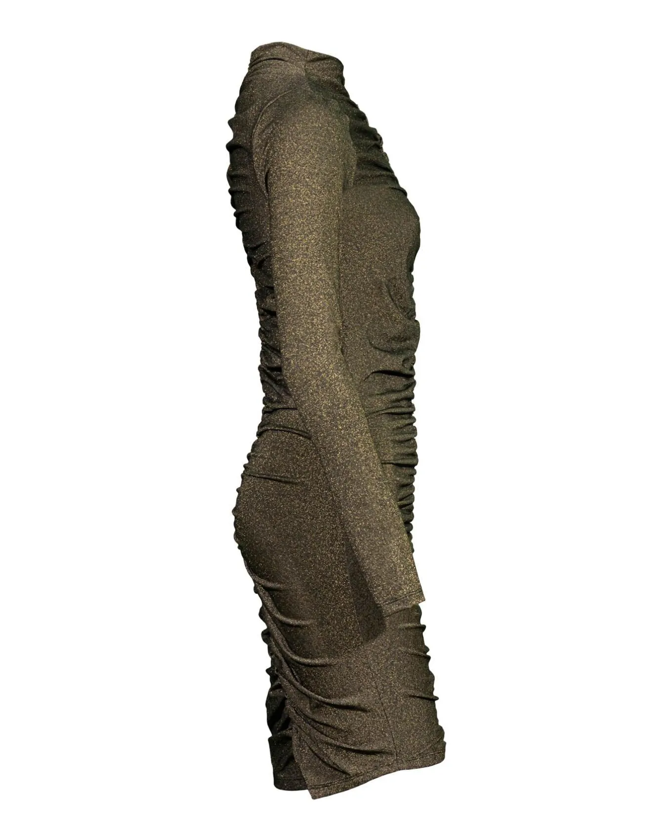 Fitted metallic rayon blend slip on dress with high neck, ruched down front and back and hem above knee
