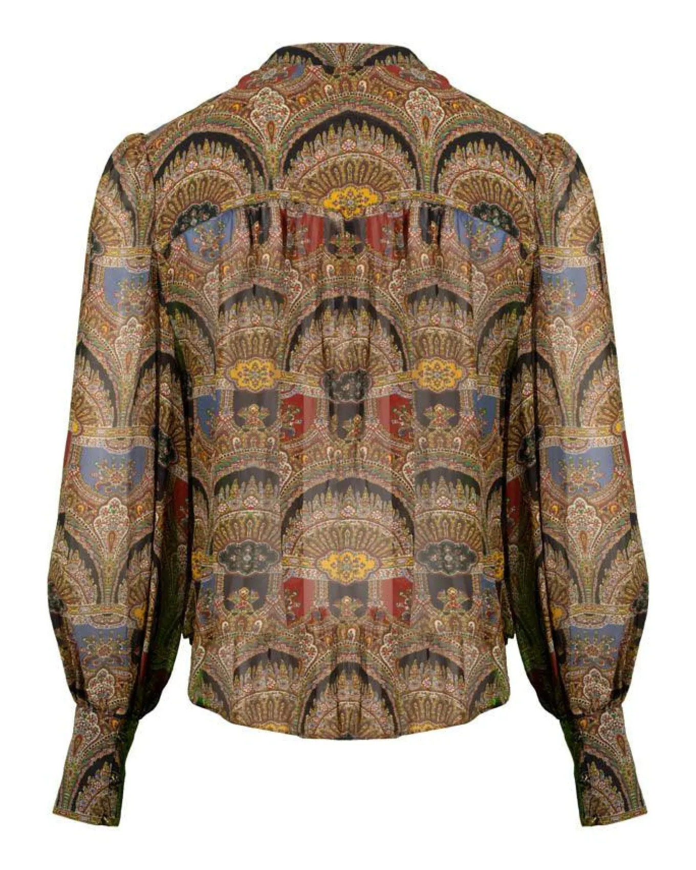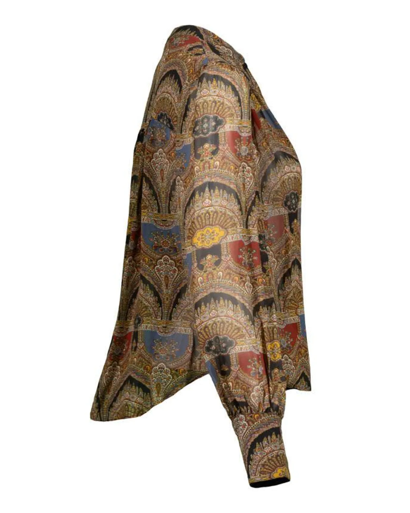 Veronica Beard silk ornate motif print blouse with v-neckline, soft gathers at shoulders, button down front, long billowy sleeves with button cuffs and rounded hem. Size S – Length 22.5″.