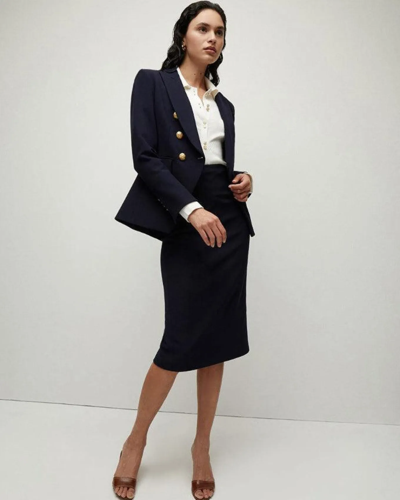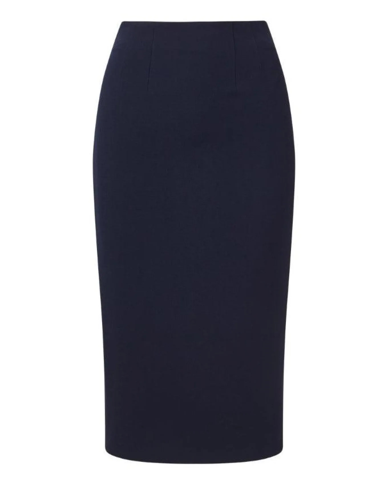 The midi silhouette exudes elegance, while the vertical seaming works wonders to subtly cinch the waist, creating a flattering shape that speaks volumes of your refined taste. Whether you’re dominating the boardroom or attending a sophisticated soirée, the Holmes Pencil Skirt ensures you make a statement of understated elegance, every time., Size 2 – Length 29″