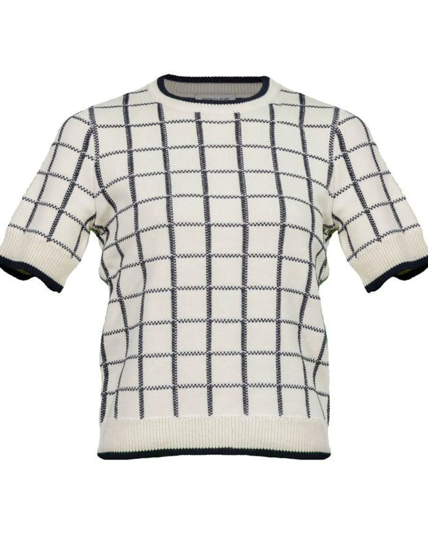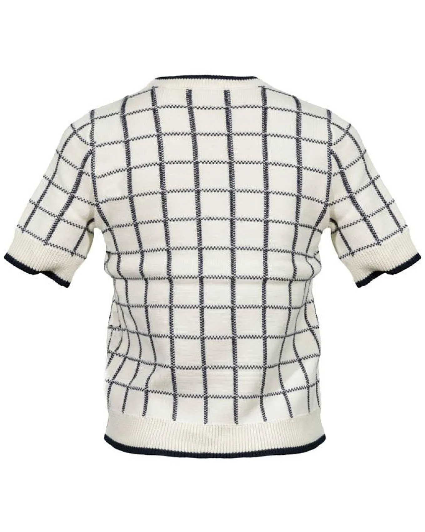 Veronica Beard check print crew neck pullover with short sleeves, ribbed cuffs and hem, contrast trim edging.