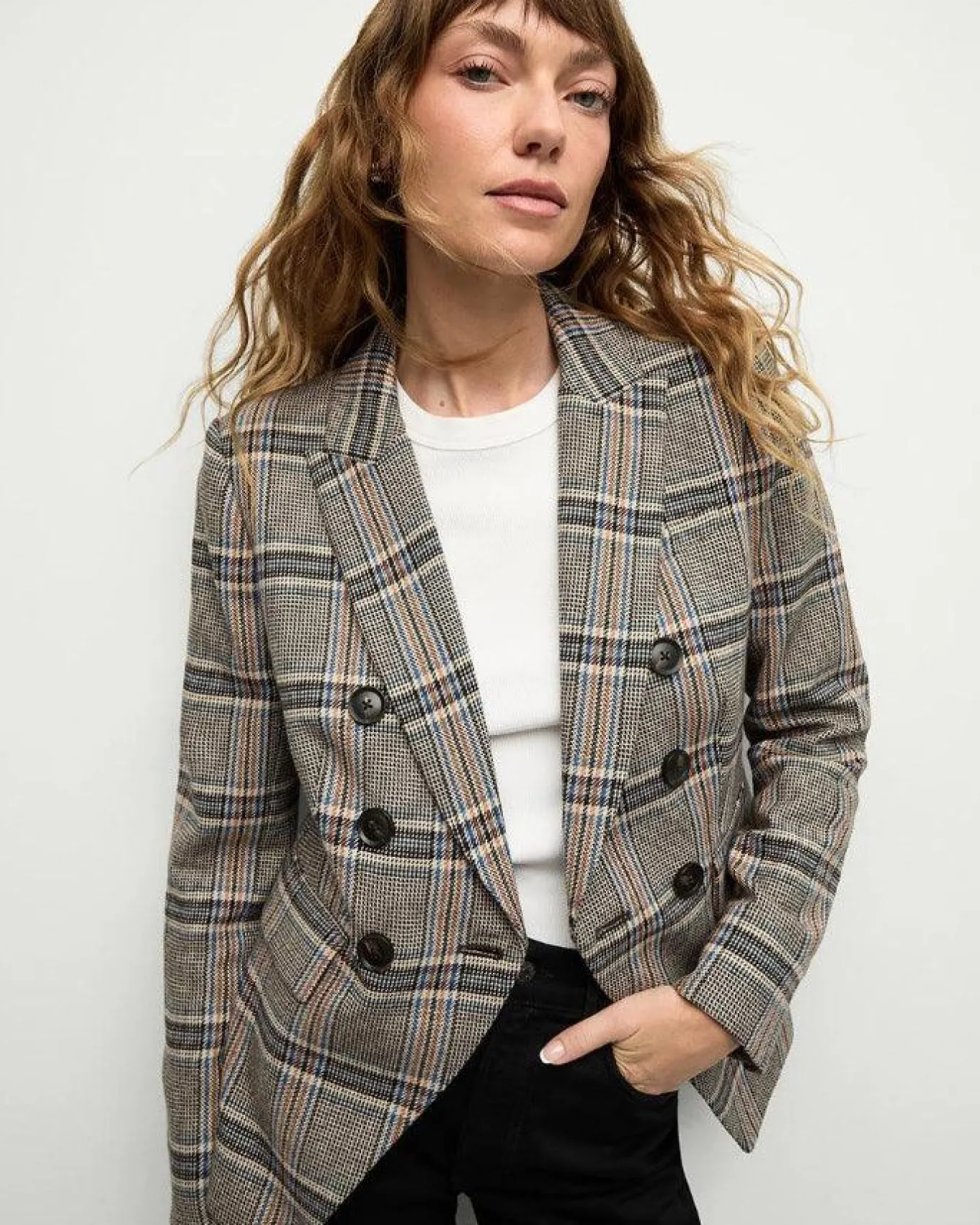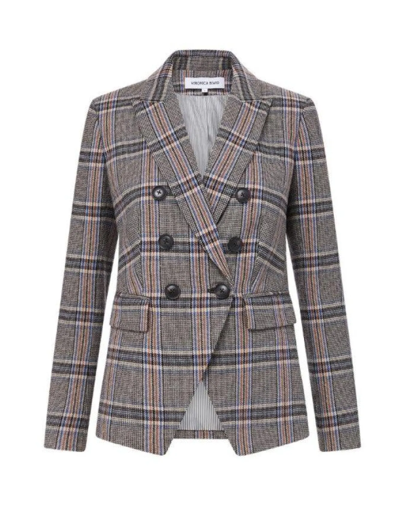 Veronica Beard bold multicolor plaid double breasted dickey jacket with peak lapel and flap pockets. Precision tailoring, slight stretch, and a slim, flattering fit.
