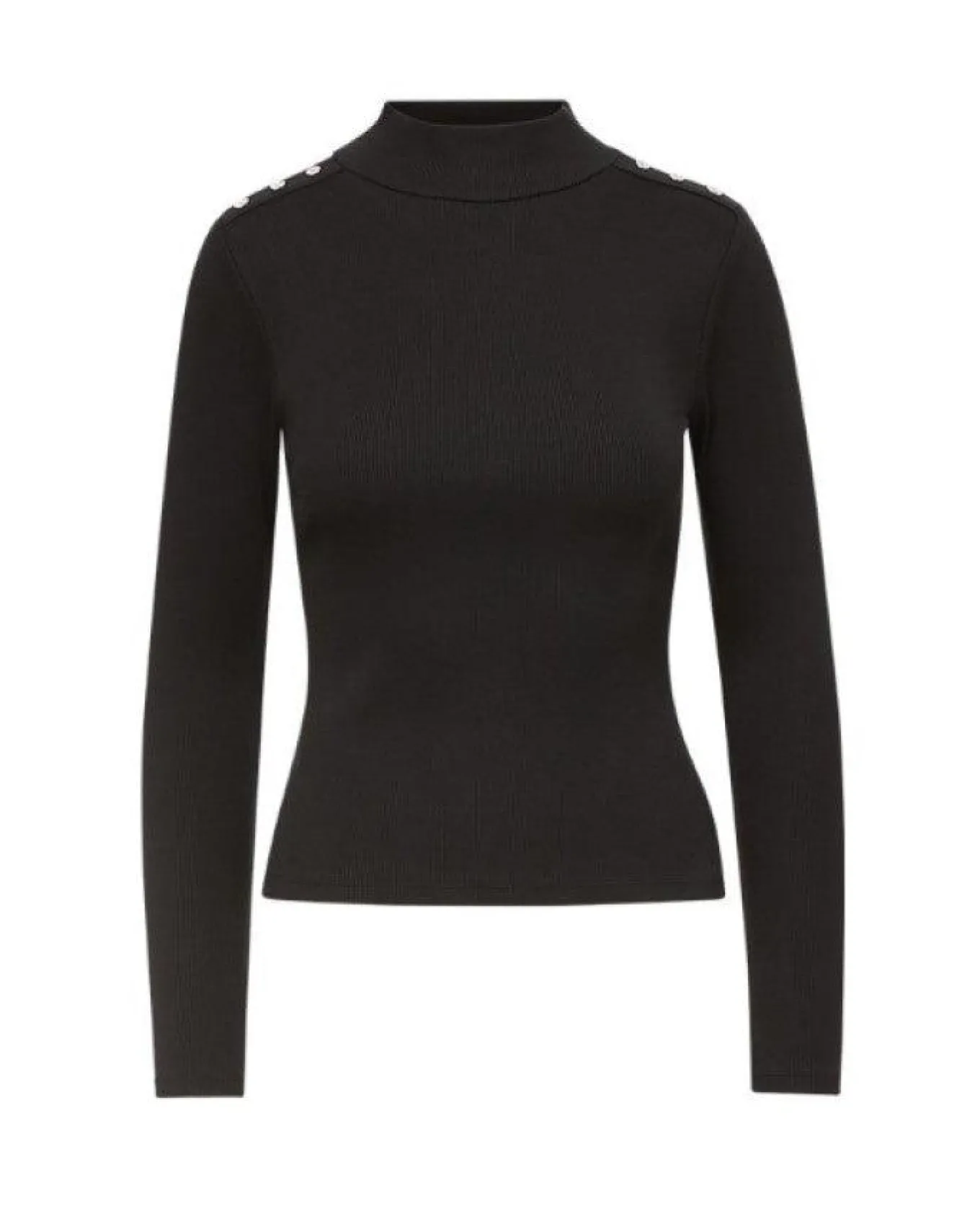 Veronica Beard classic stretch cotton long sleeve tee with mock neck and button embellishments on the shoulder. Slim fit. Size S – Length 21.25″, Sleeve length 30.25″.