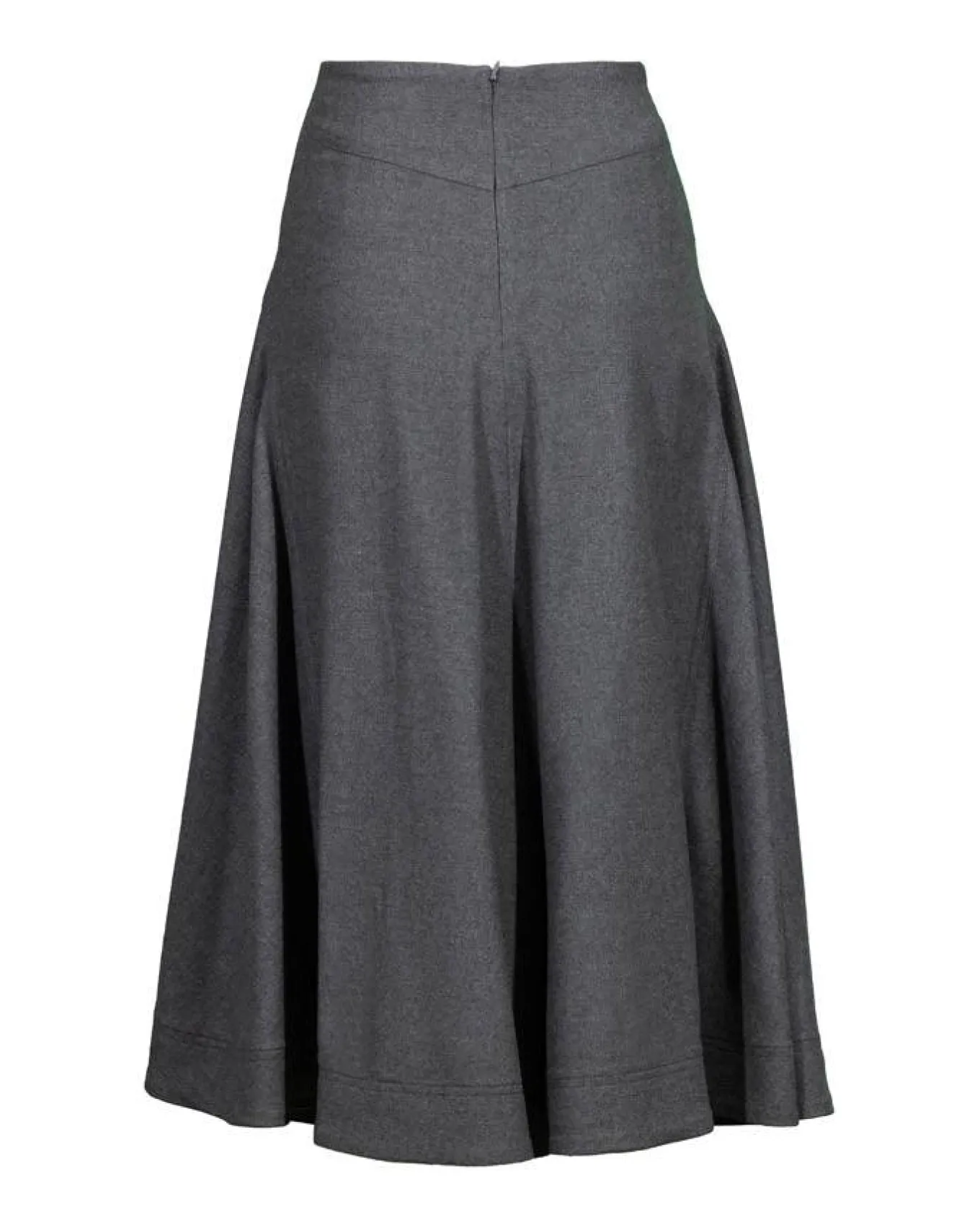 Veronica graceful, flowing wool blend A-line silhouette midi skirt with a seamed front and back yoke, concealed back zip closure, high rise fit.