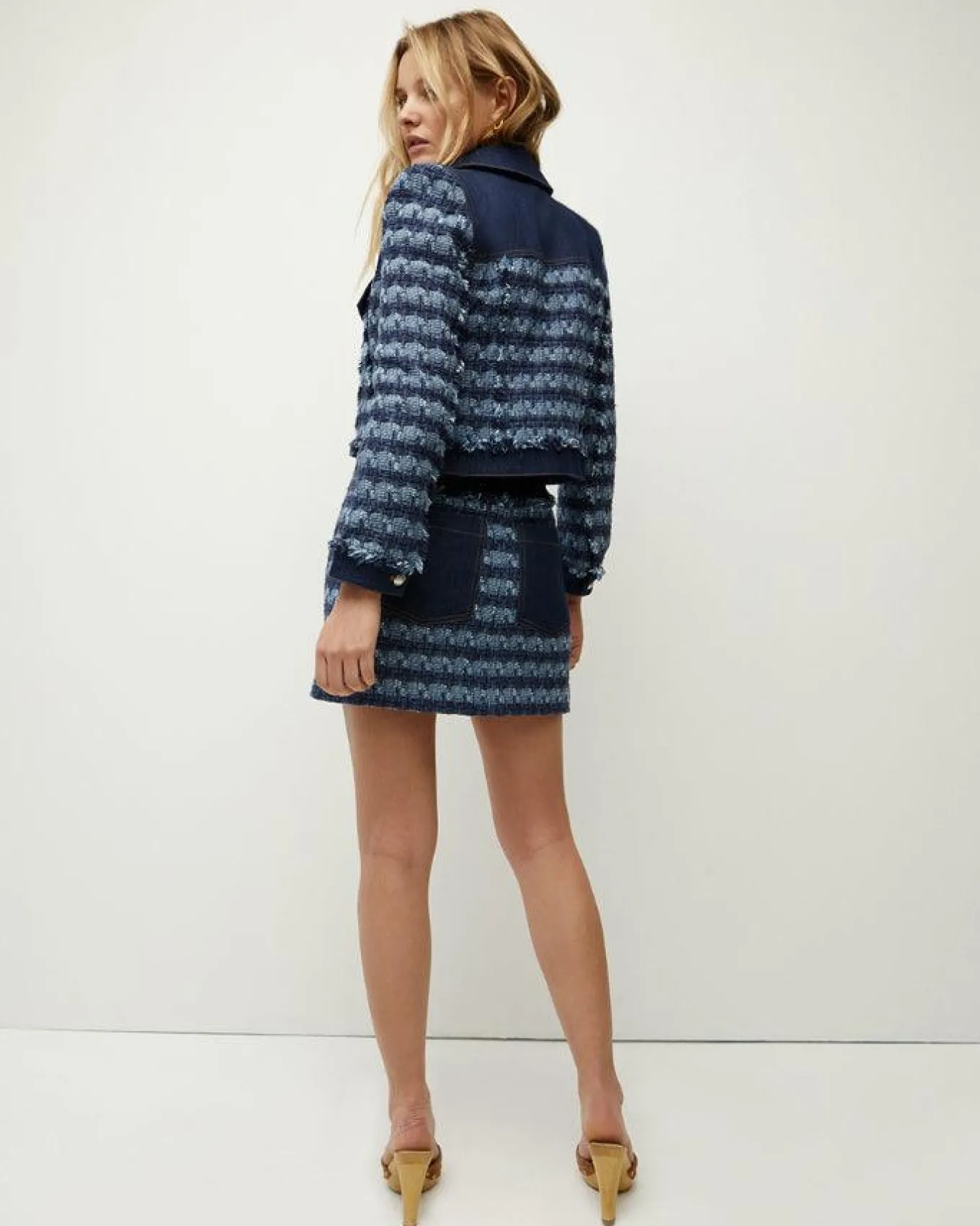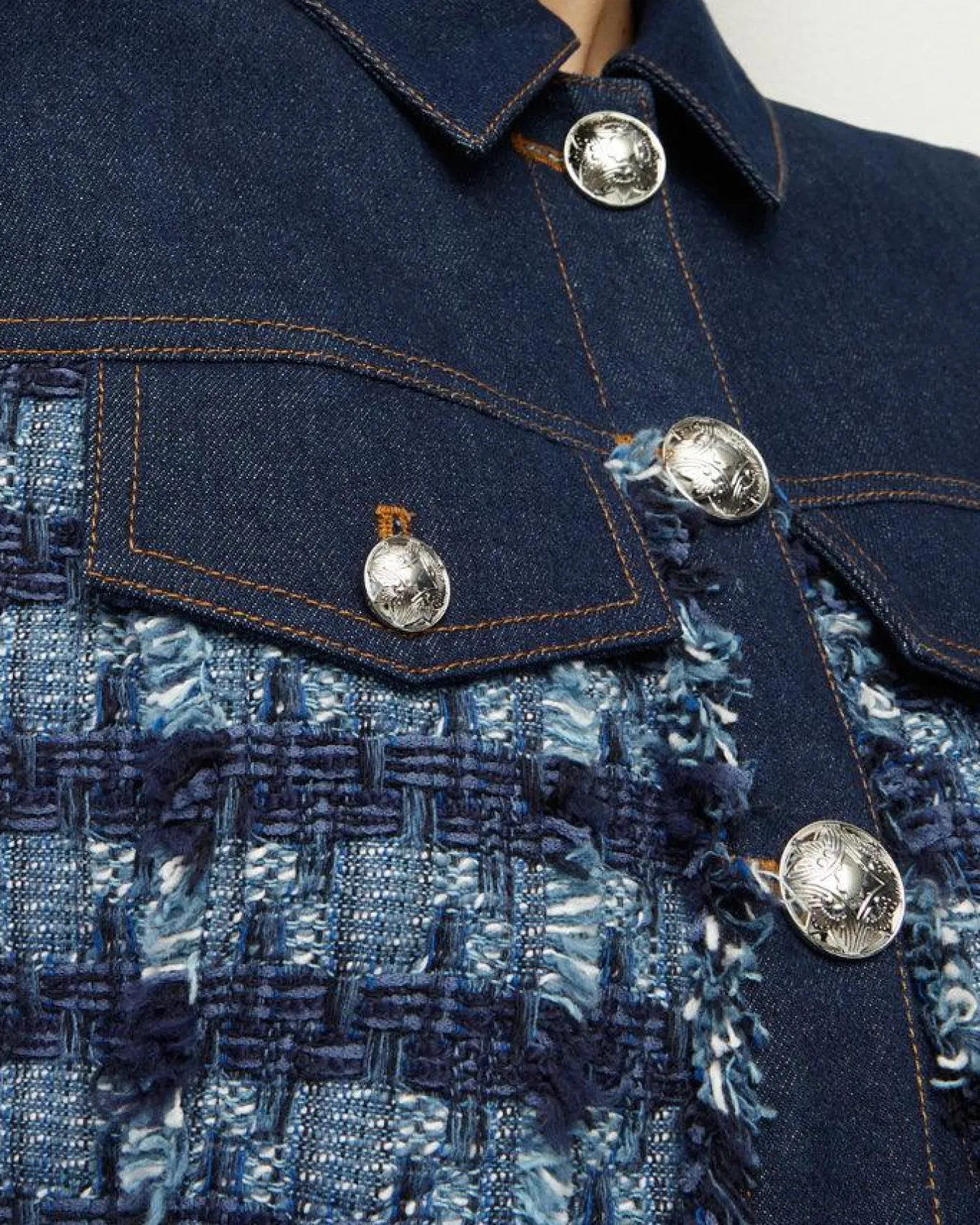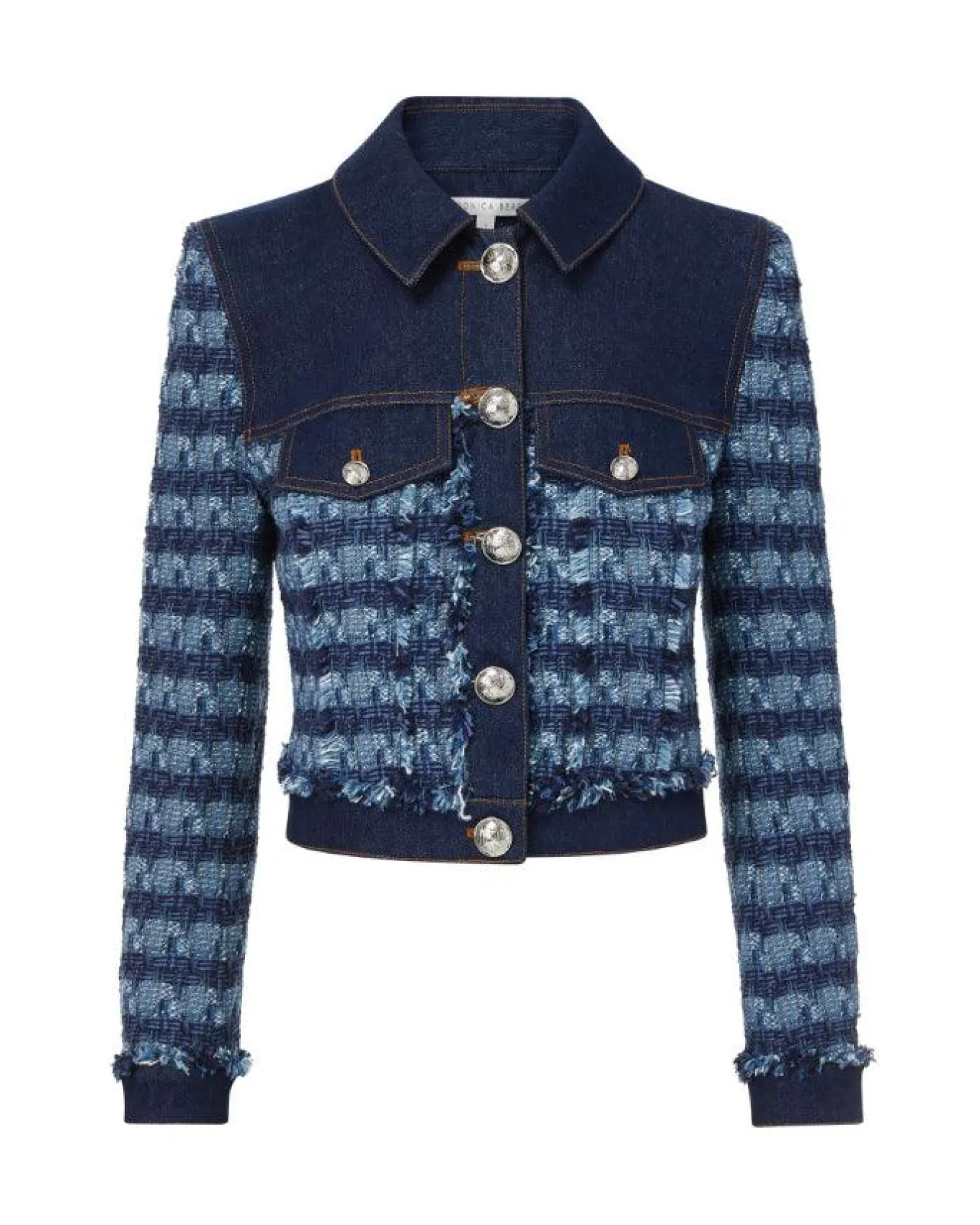 Relaxed meets refined with this denim meets tweed jacket complete with a trim collar, contrast-color stitching, padded shoulders and our signature metal crest buttons, boxy style, Size 2 – Sleeve Length 31 3/4″,Length 20 1/8″
