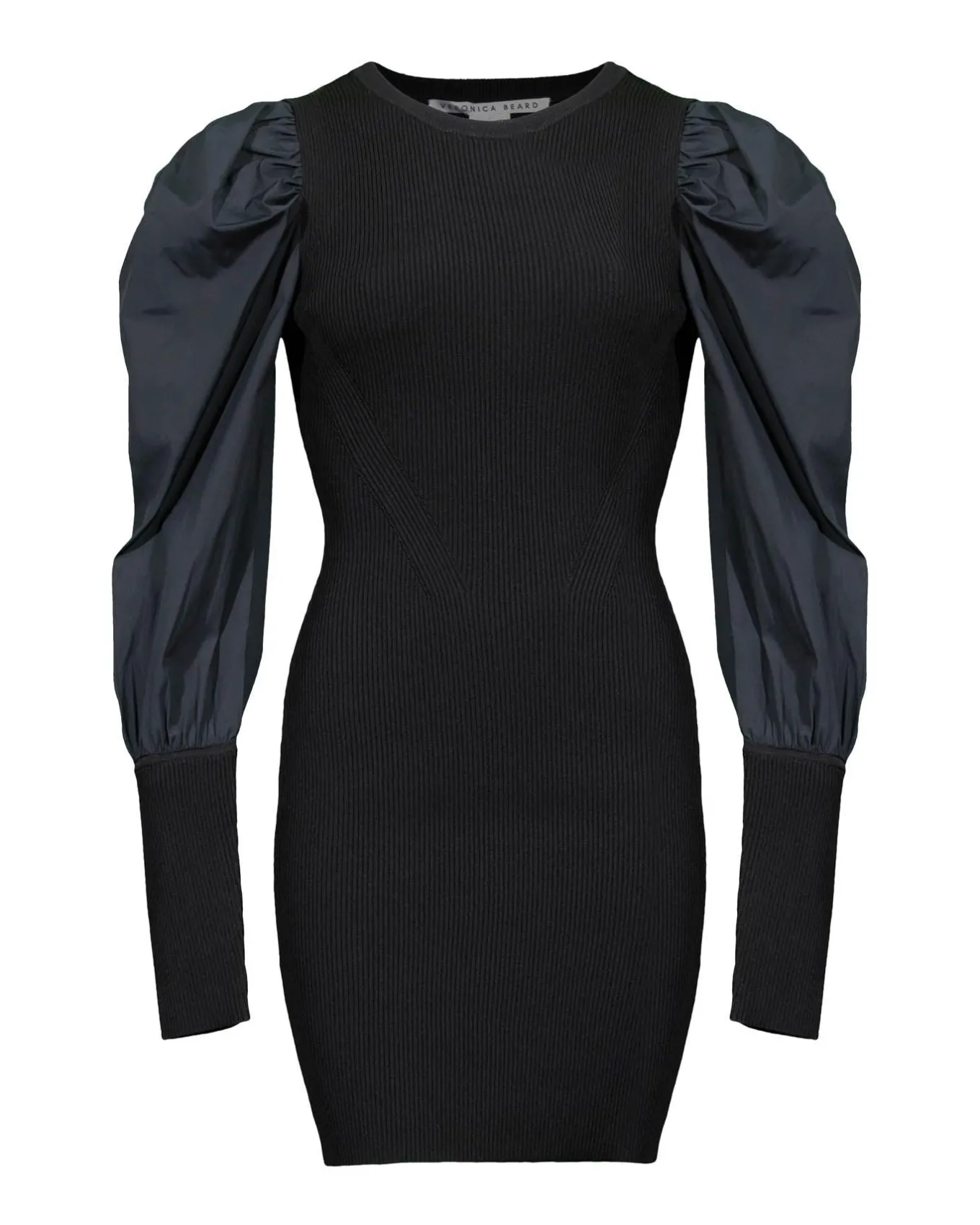 Fitted bodycon silhouette ribbed knit slip on mini dress with long puff sleeves that have an extra wide ribbed cuff, Approximate 63″ Length