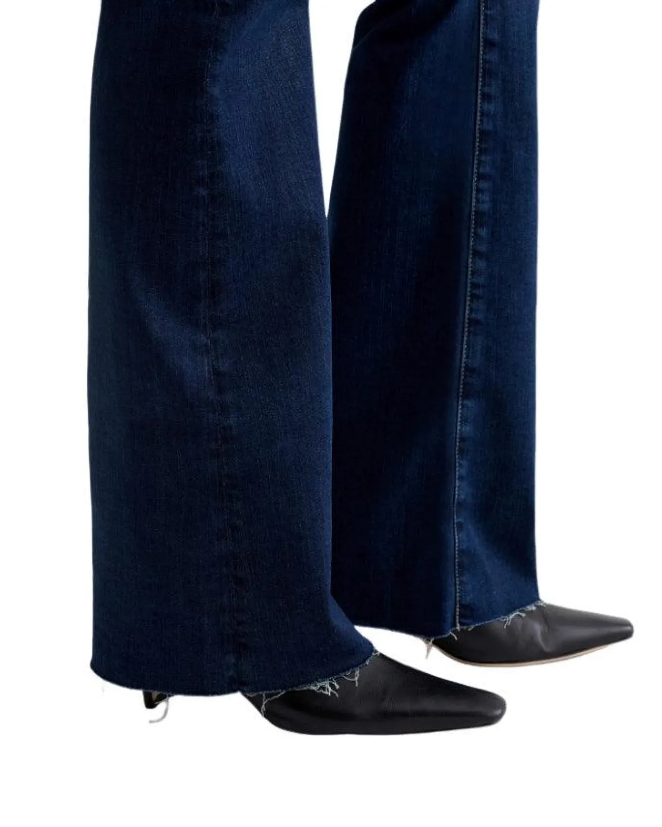 AG Jeans dark blue wash stretch denim Farrah jeans sit high on the waist and have a skinny fit through the leg before opening into a subtly flared raw hem, classic five pocket styling with button and zip closure. Size 25 – Front Rise 10″, Inseam 32″, Knee Opening 14″, Bottom Opening 18.5″.