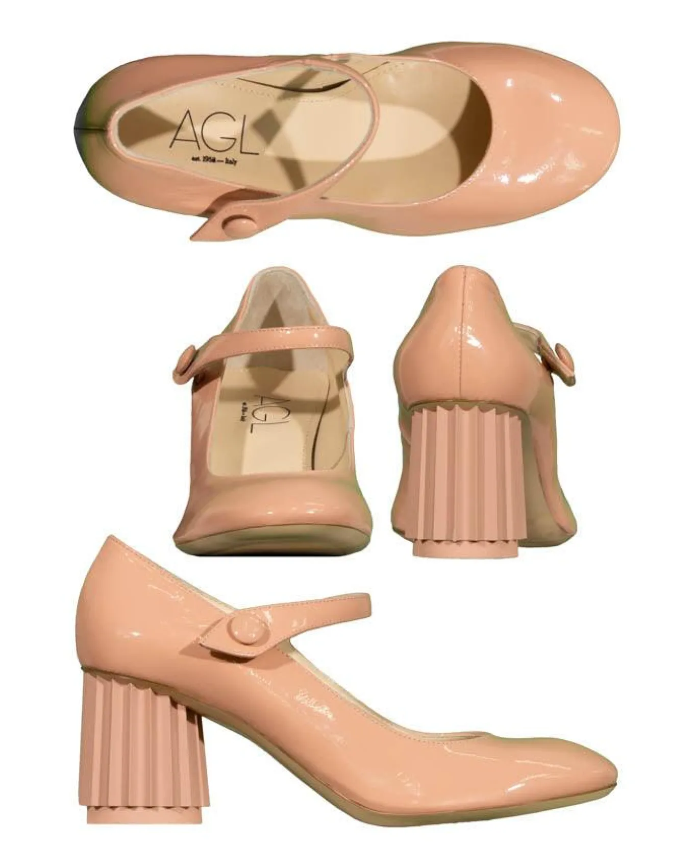 AGL ankle strap pump with girlish charm elevated by the designed mid-height Doric column heel and decorative little side button. Shoe can be slipped on thanks to the elastic hidden under the ankle strap. Patent lambskin upper, shock-absorbing insole with activated charcoal, leather sole with rubber insert, 6.5cm heel.