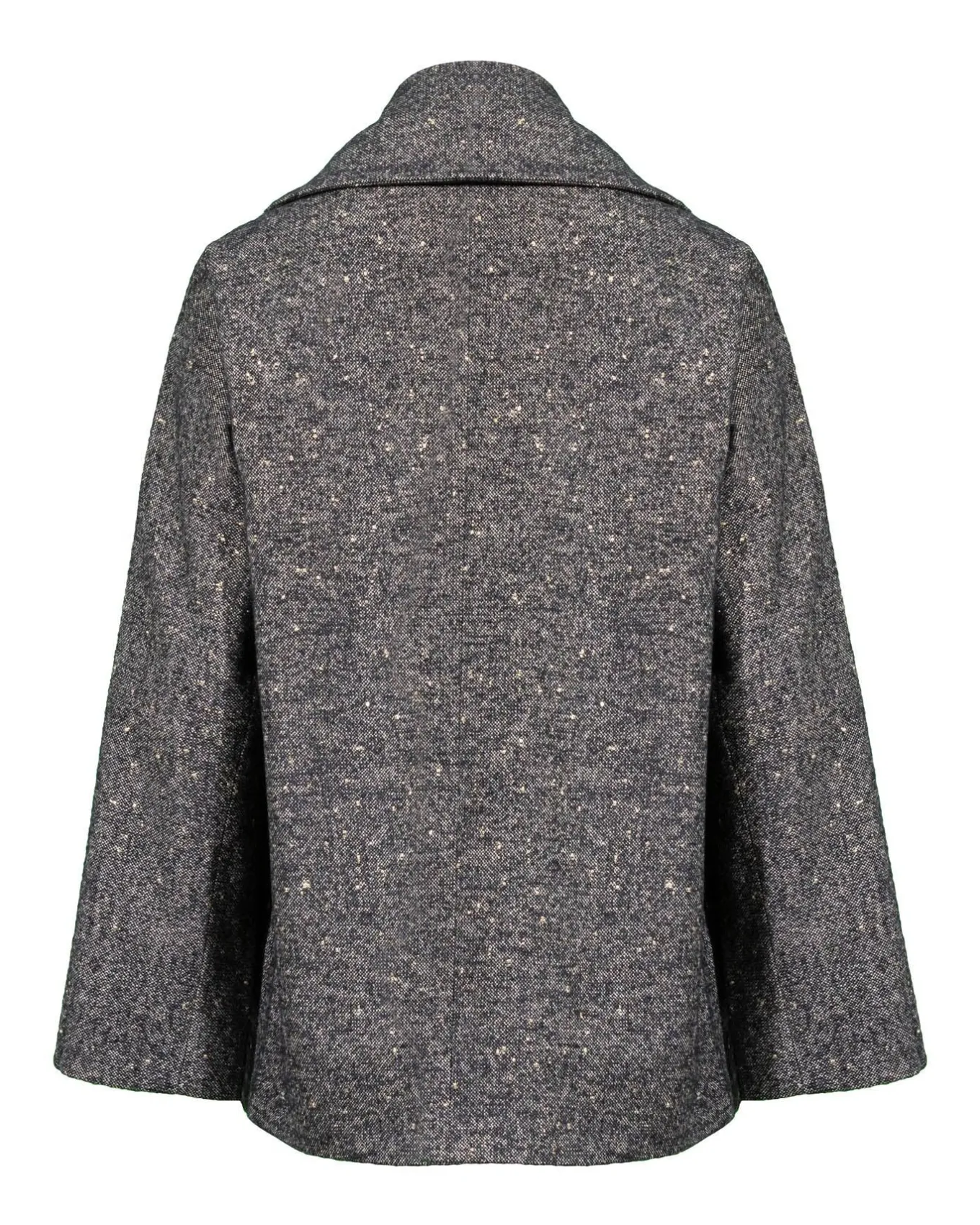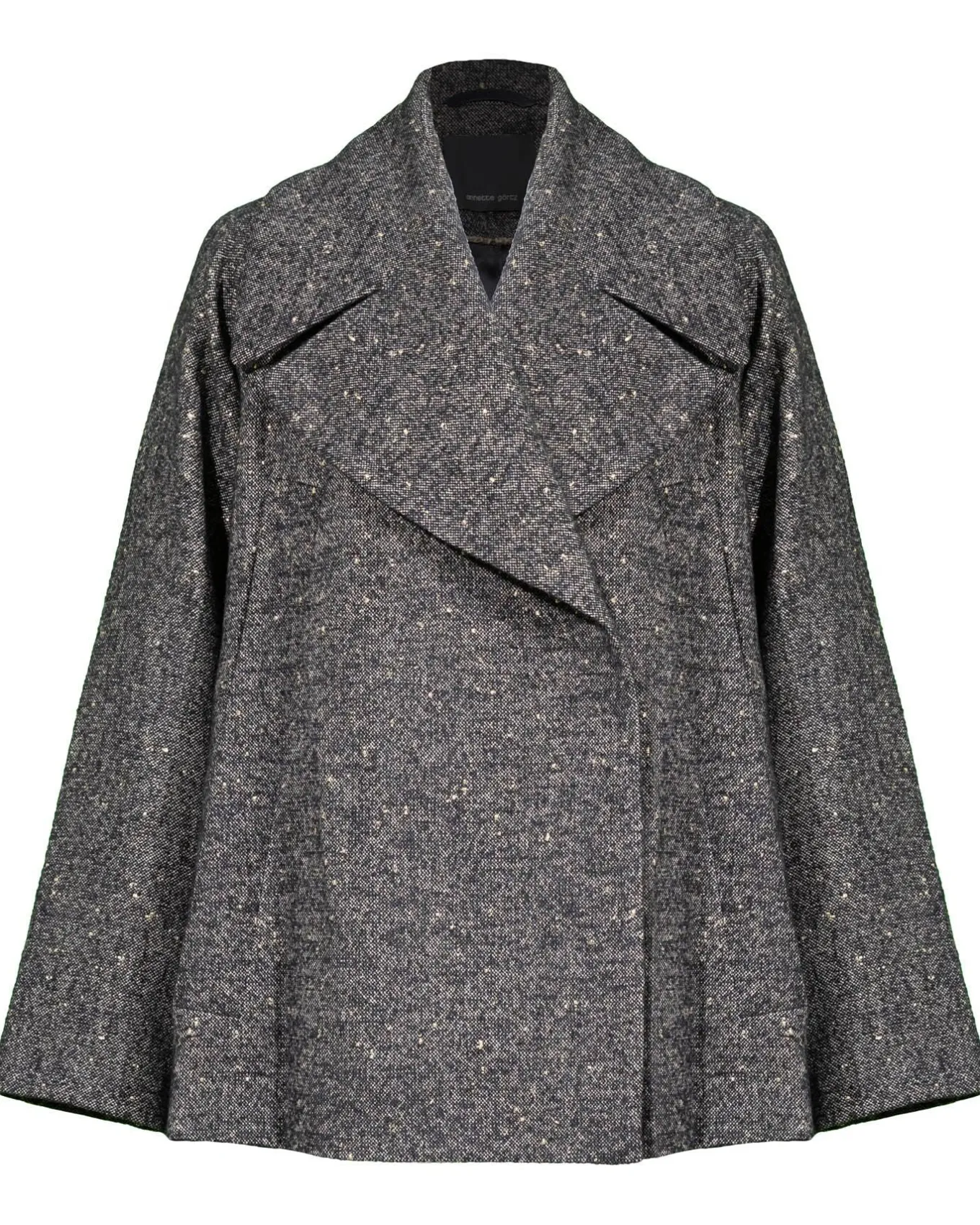 Annette Gortz oversized textured wool blendflared wool jacket with wide notch lapel collar, double welt pockets, concealed button placket, long slit at the back and slits at sleeve cuffs.