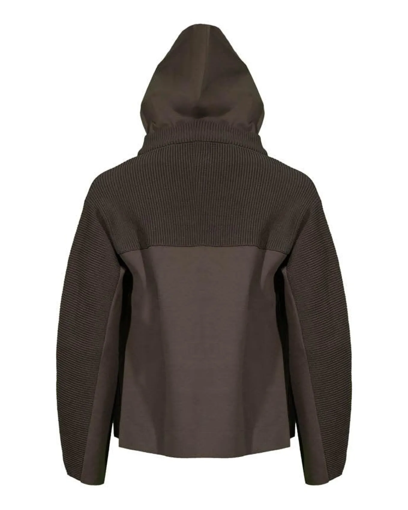 Annette Gortz’s new sporty knit cardigan jacket with a loose fit. It features a square patch pocket, front zipper closure, a large hood, rounded sleeves, and textured, ribbed pearl stitch knit. Fit: Straight