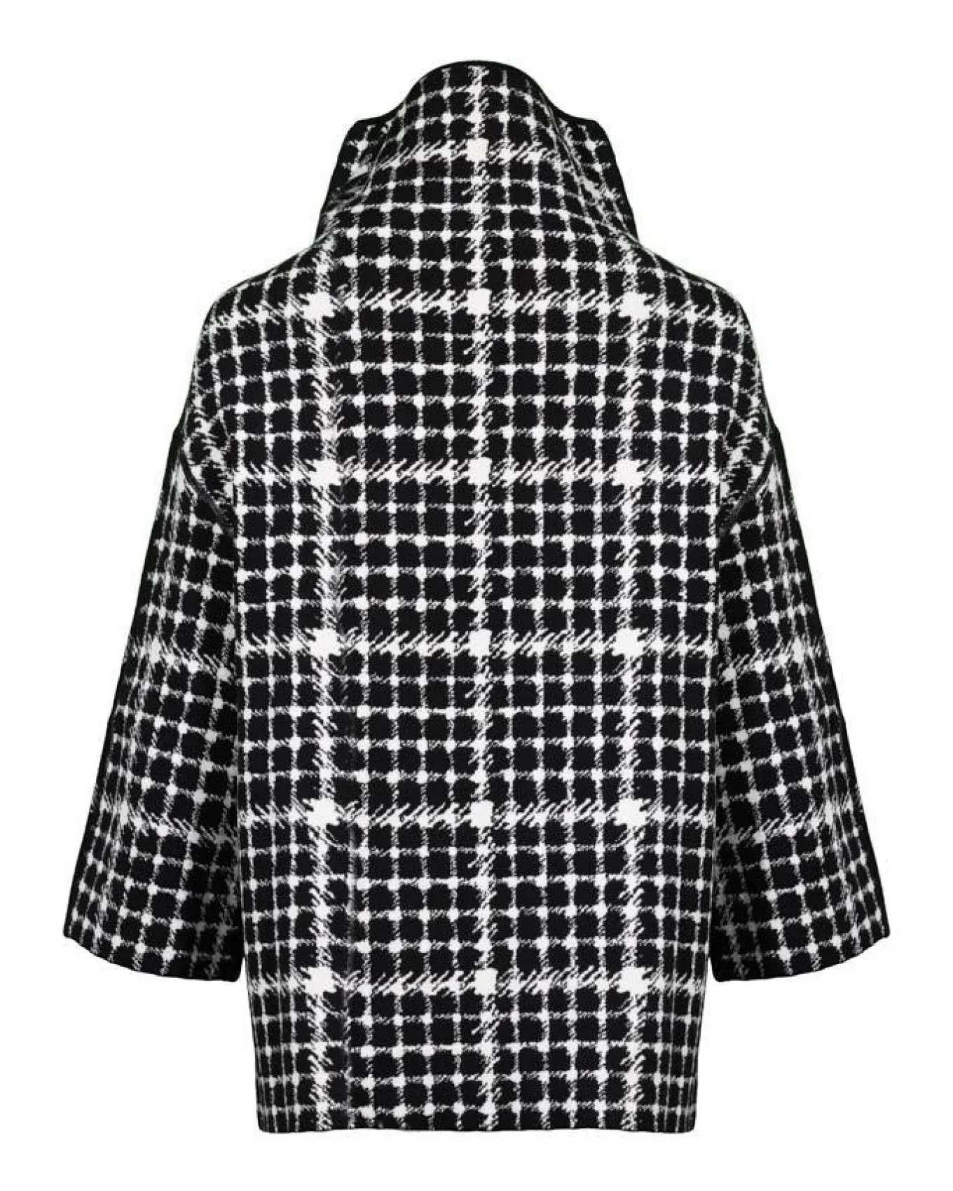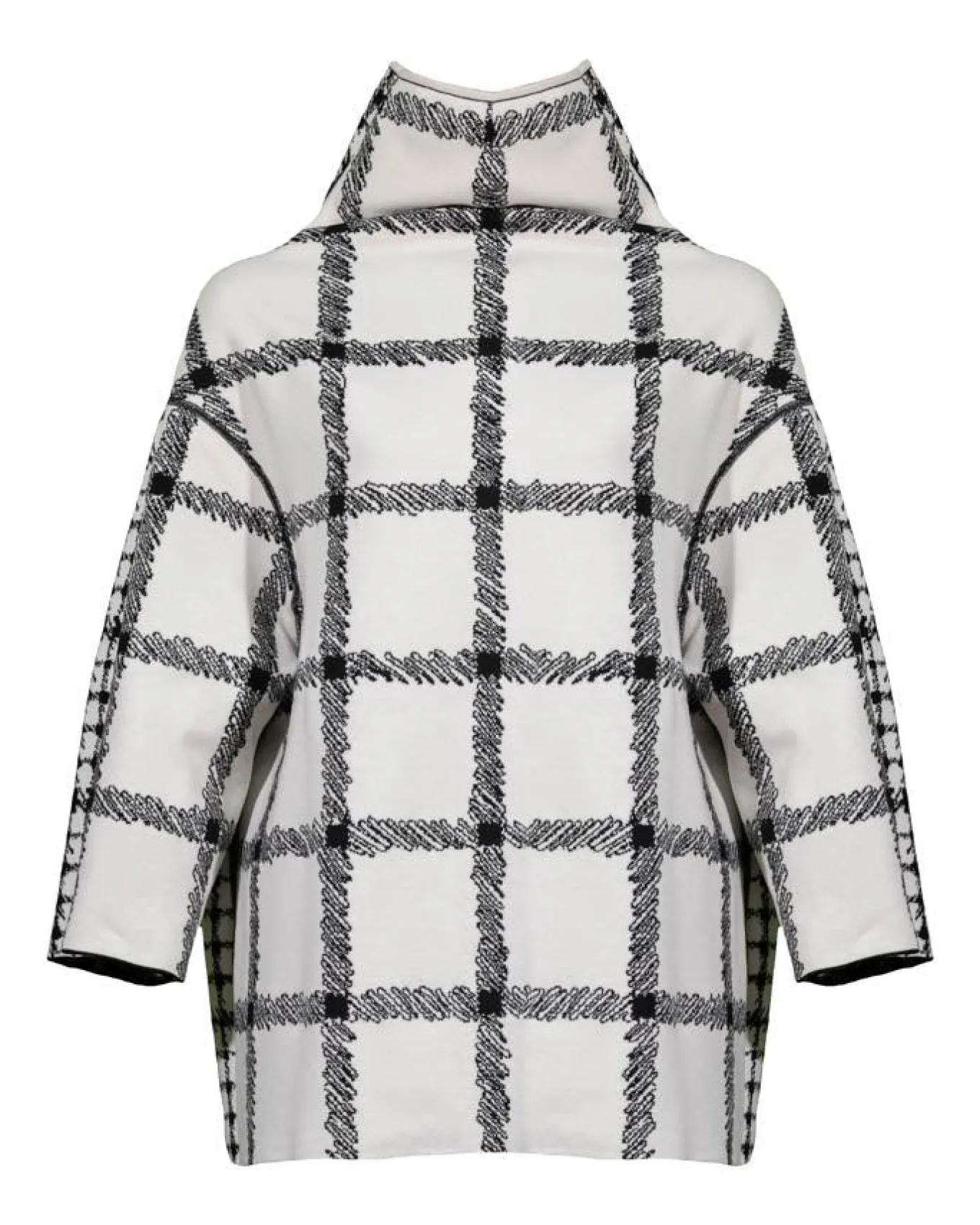 Annette Gortz reversible straight cut wool pullover in a knitted double layer with hand drawn check pattern, avantgardistic collar with soft drape, 3/4 sleeves, reversible design allows both color variations.