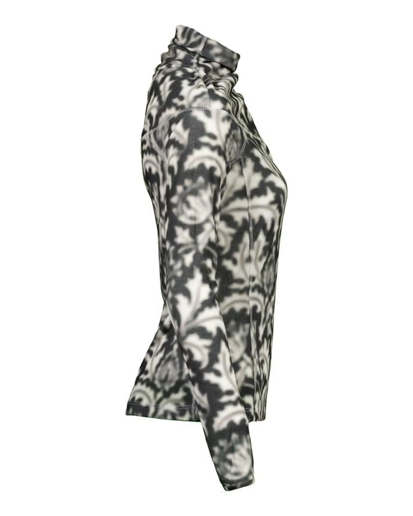 Annette Gortz slim fit fine ribbed jersey funnel neck pullover with sportswear-inspired seam detailing, long sleeves and floral allover print with blur effect.