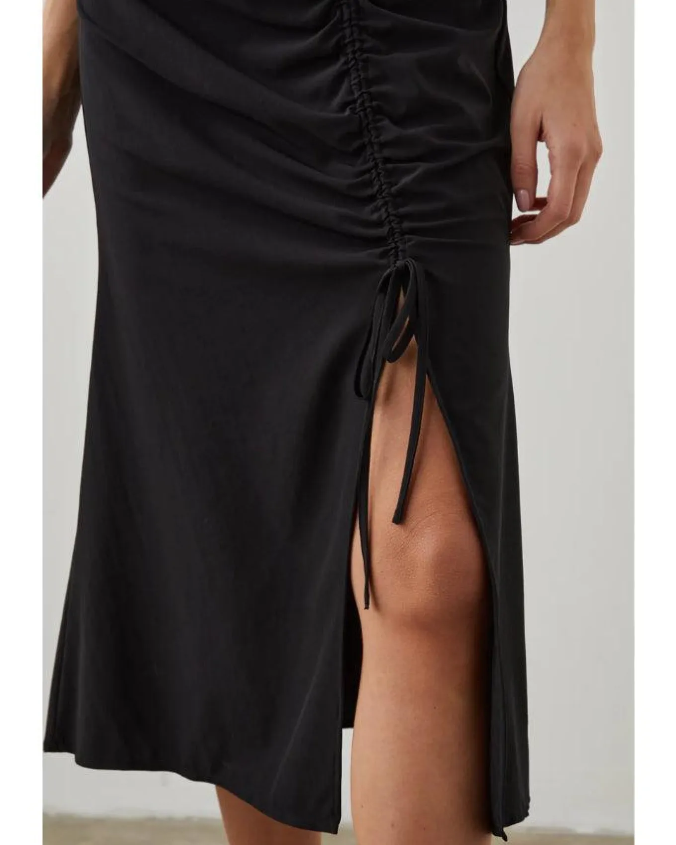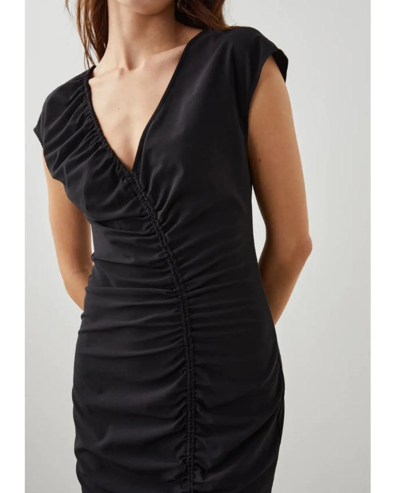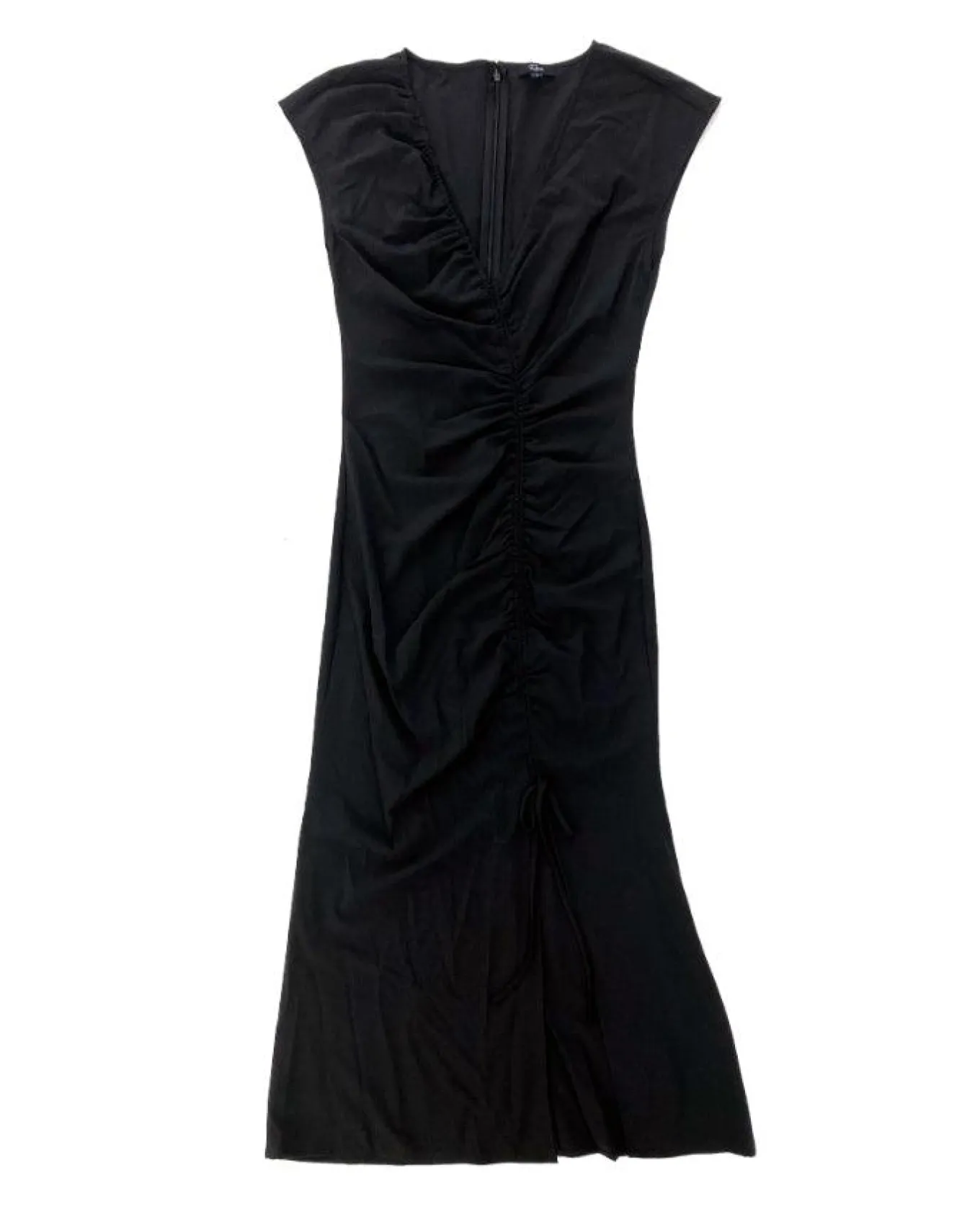 Stylish stretchy nylon crepe cap sleeve midi dress with a low v-neckline, ruching down bodice leading to open front slit and cocealed back zip closure, Size S – Length 49 1/4″