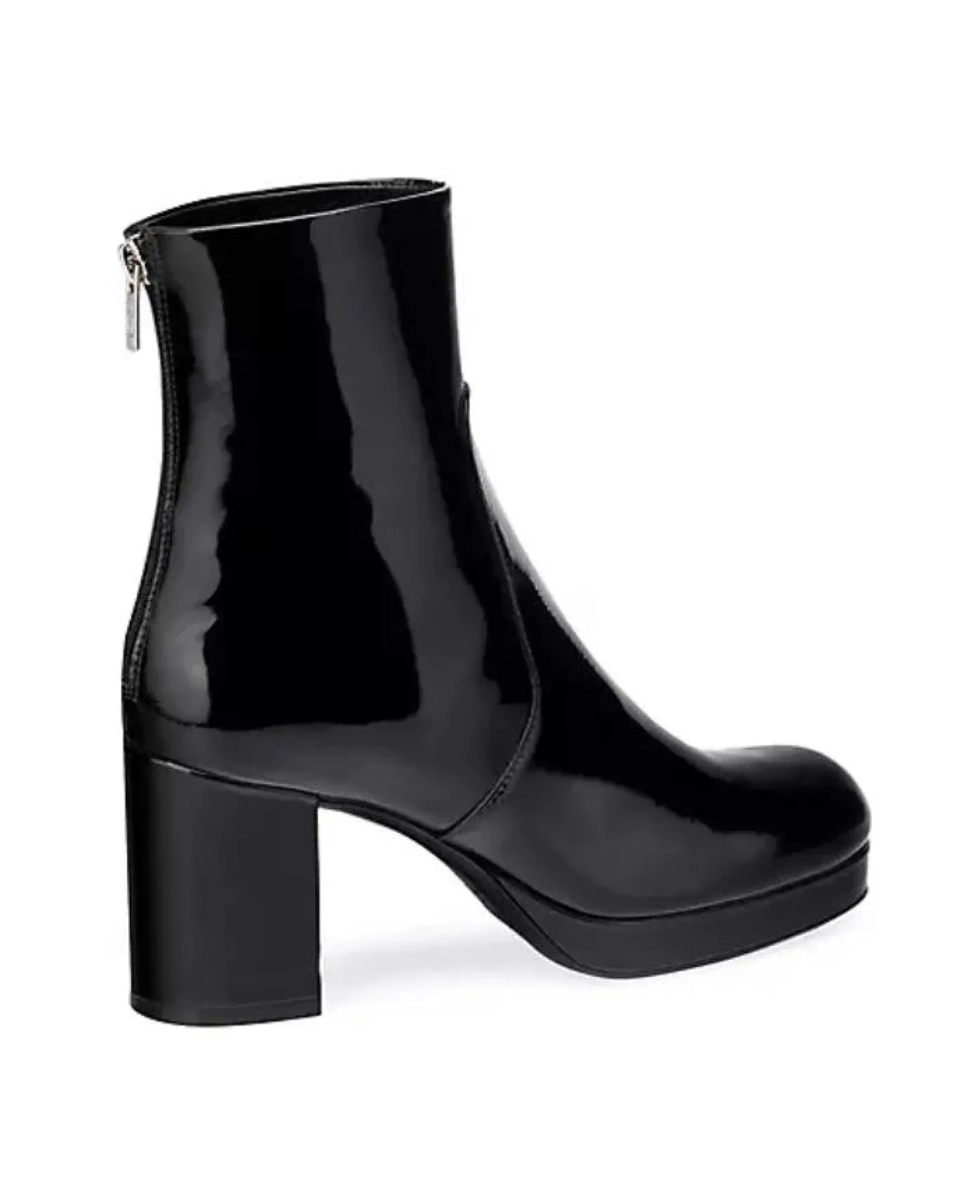 Shiny patent leather platform ankle boot with back zipper closure, round toe and leather sole, Block heel height 3″