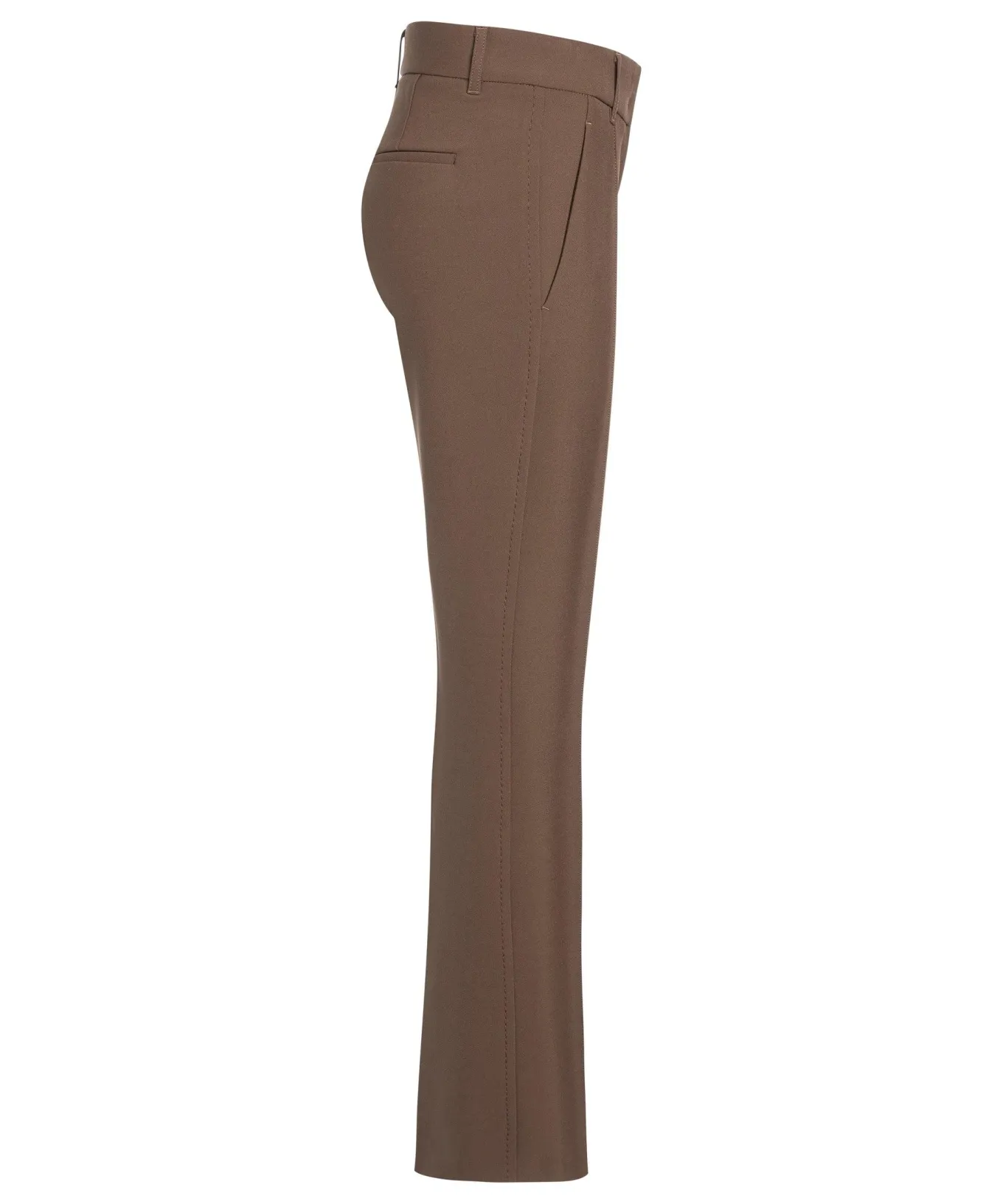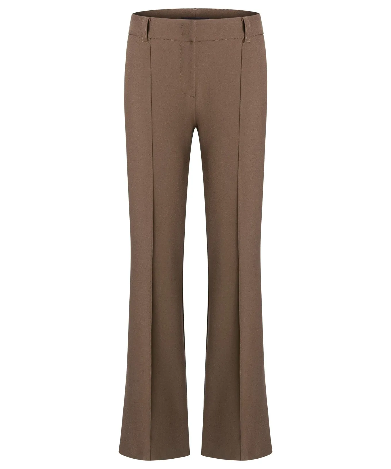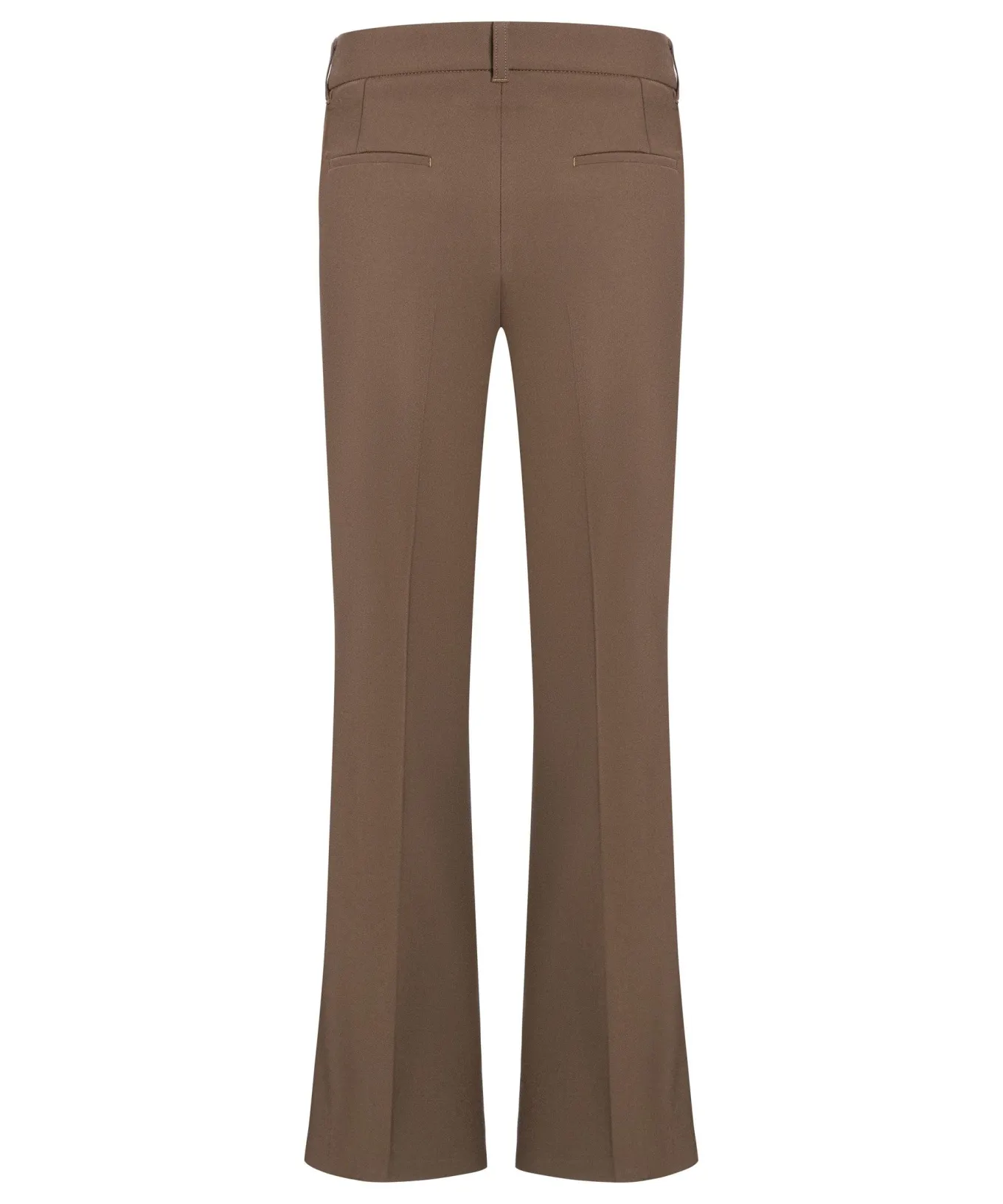 Comfortable stretch fabric flared full length trousers with slash front pockets, welt back pocket, front centre seam, hook and zip closure.
