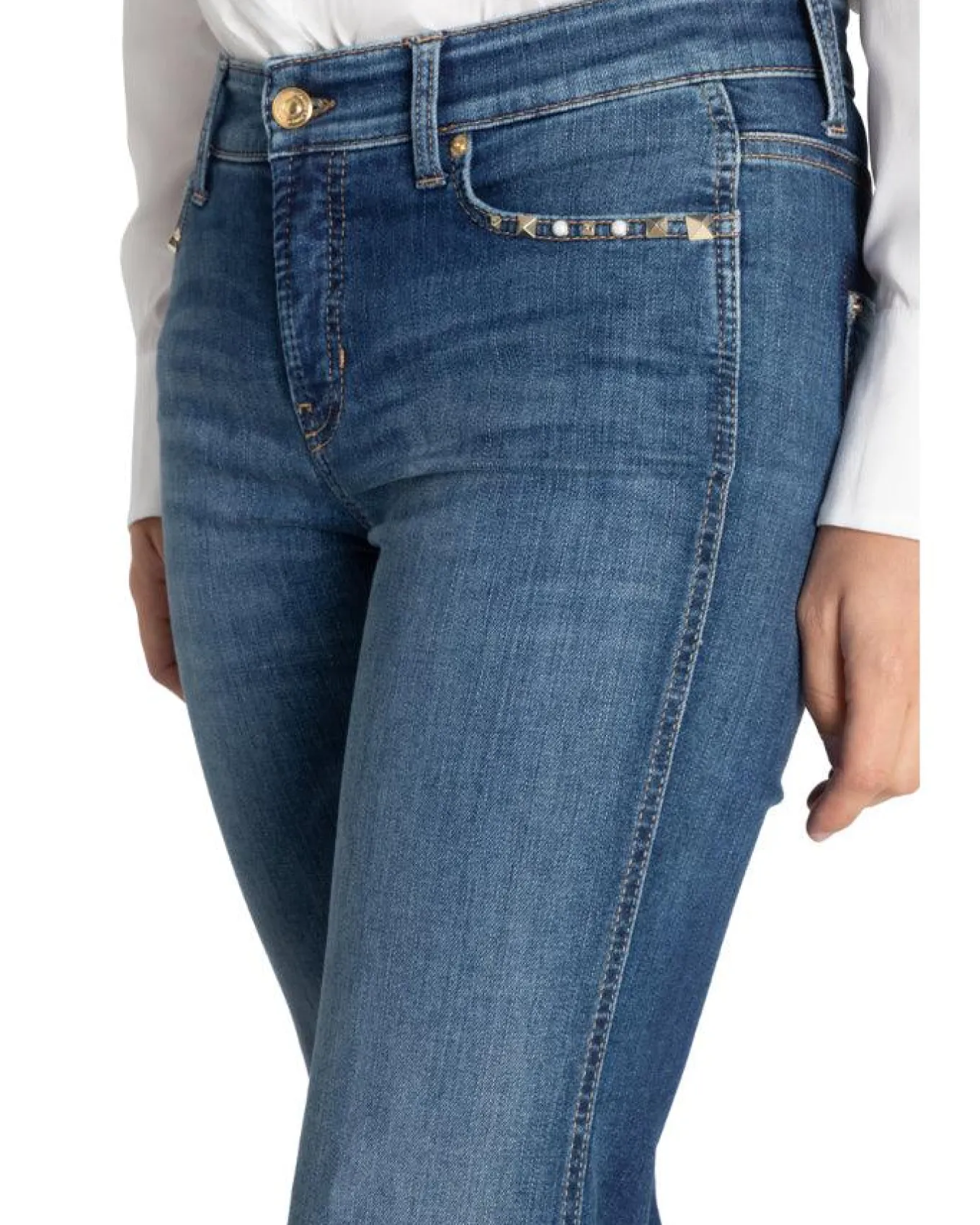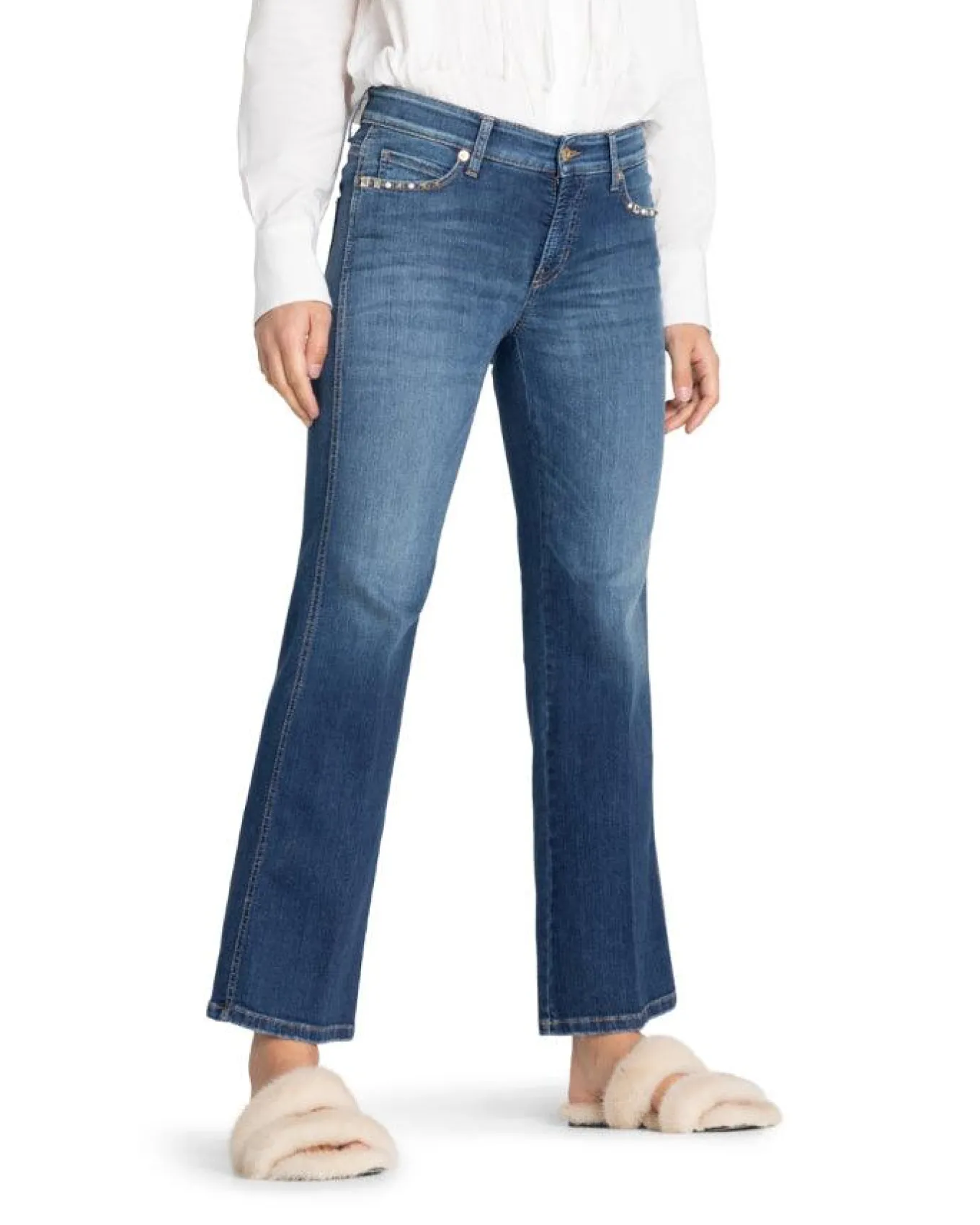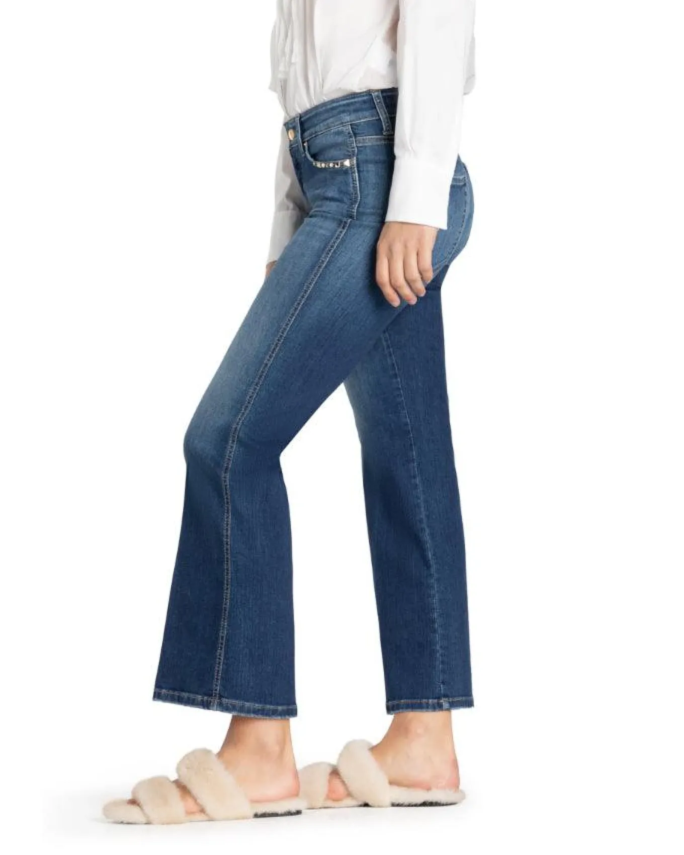 Cambio cotton stretch straight leg ankle jeans with slight flare, classic five pocket styling with decorative front pocket trim detail, button and zip closure, Size 32 – Length 28″.