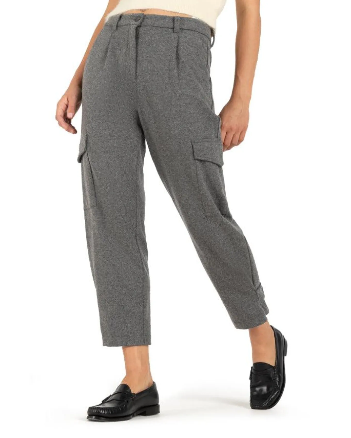 Cambio trendy, lightweight wool blend cropped pants with front pleat, cargo pockets, front slant pockets, back welt pockets, tapered leg with adjustable button ankle tab, button and zip closure, Size 32 – Length 28″.