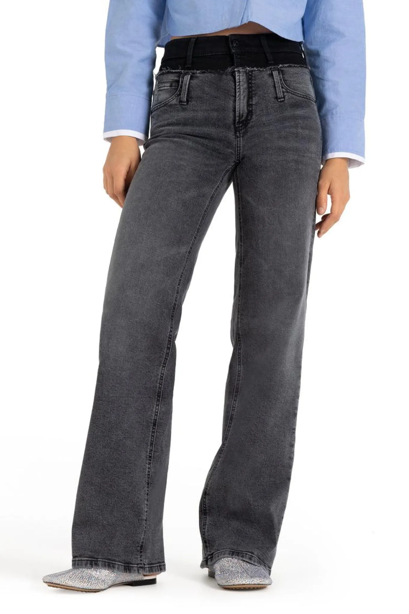 Cambio soft feel stretch denim straight, wider legjeans features a two tone double waist with raw edge seam detail, classic five pocket styling, button and zip closure, high rise, Size 32 – Length 34″.
