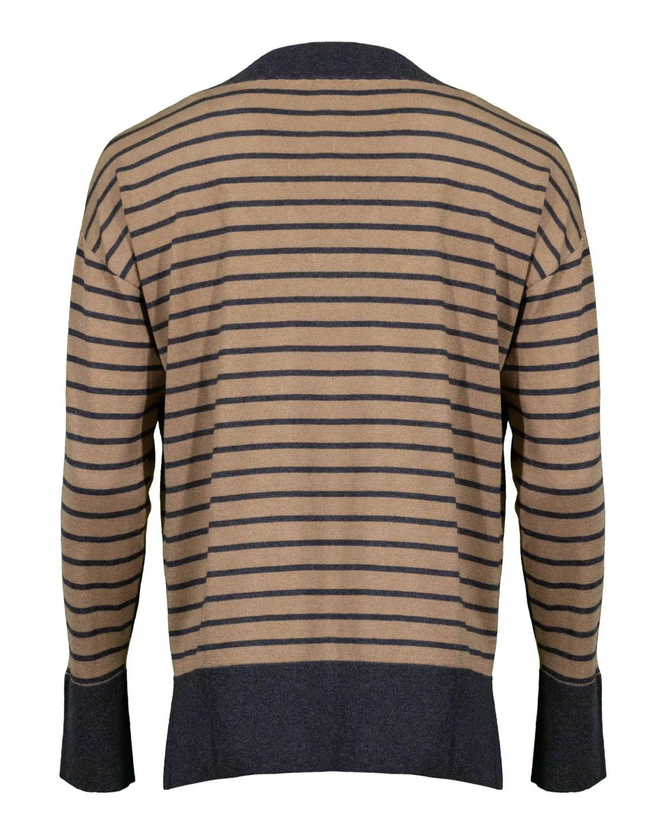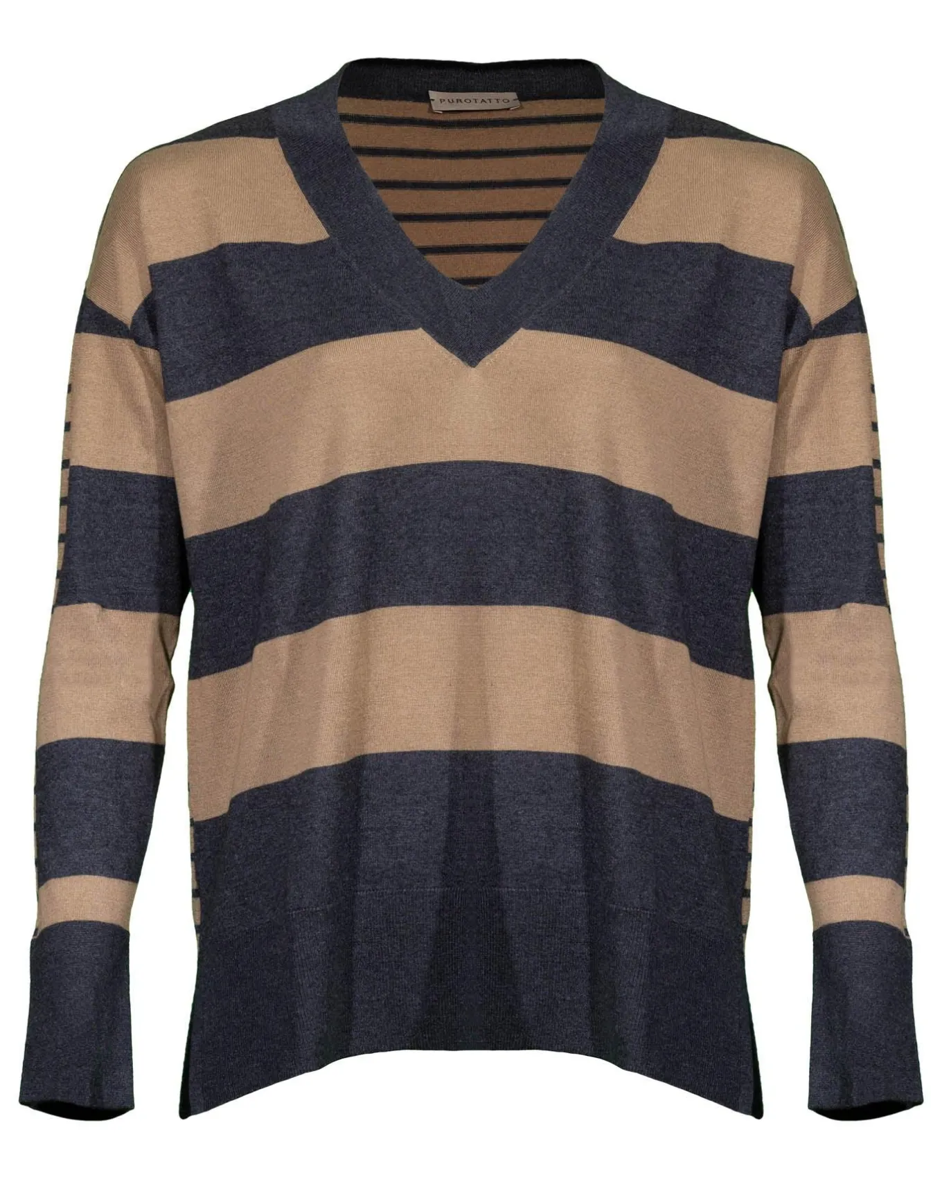 Soft fine knit silk cashmere blend v-neck pullover with contrast wide stripes on front and narrow stripes on back,wide ribbed cuffs and hem with side slits