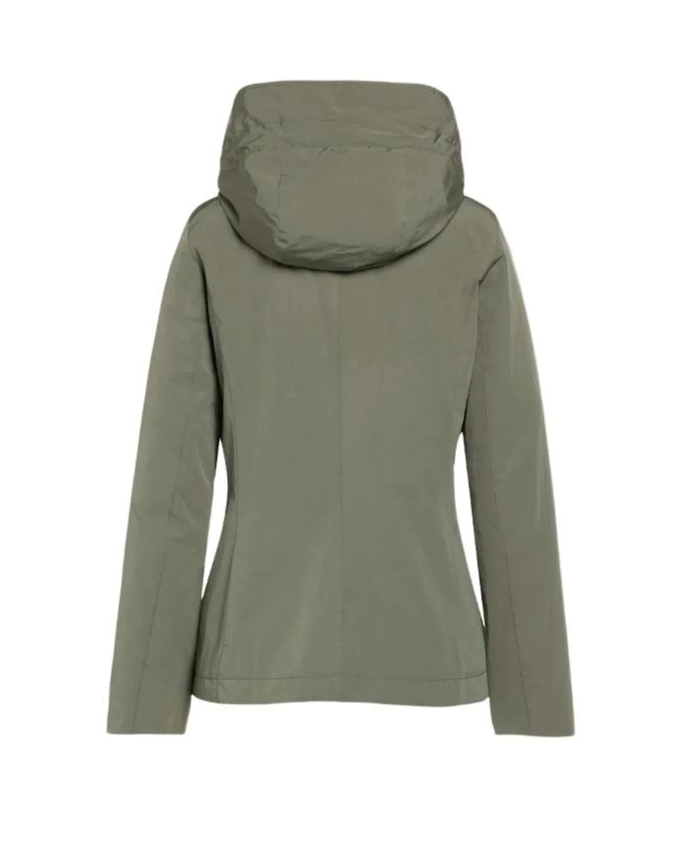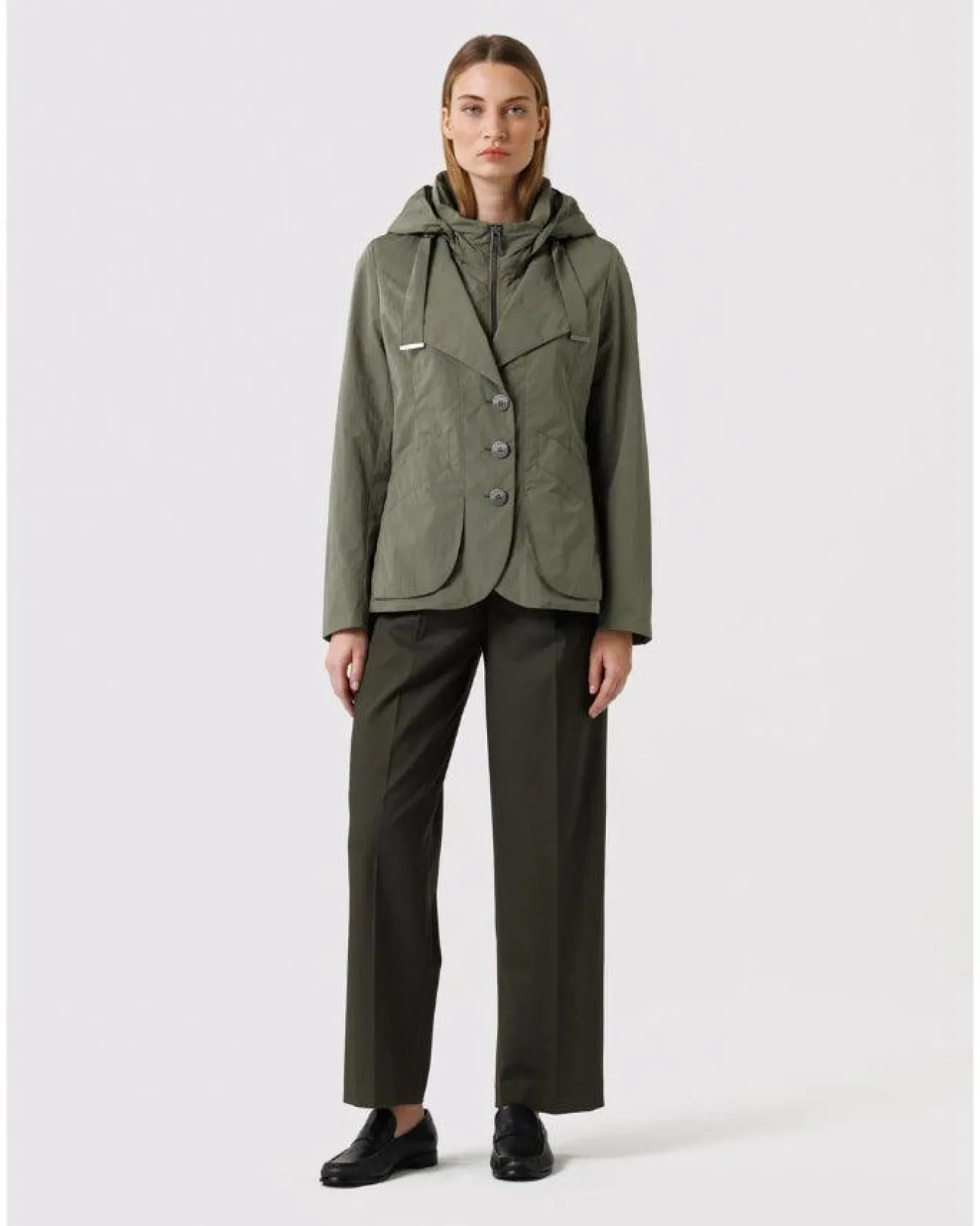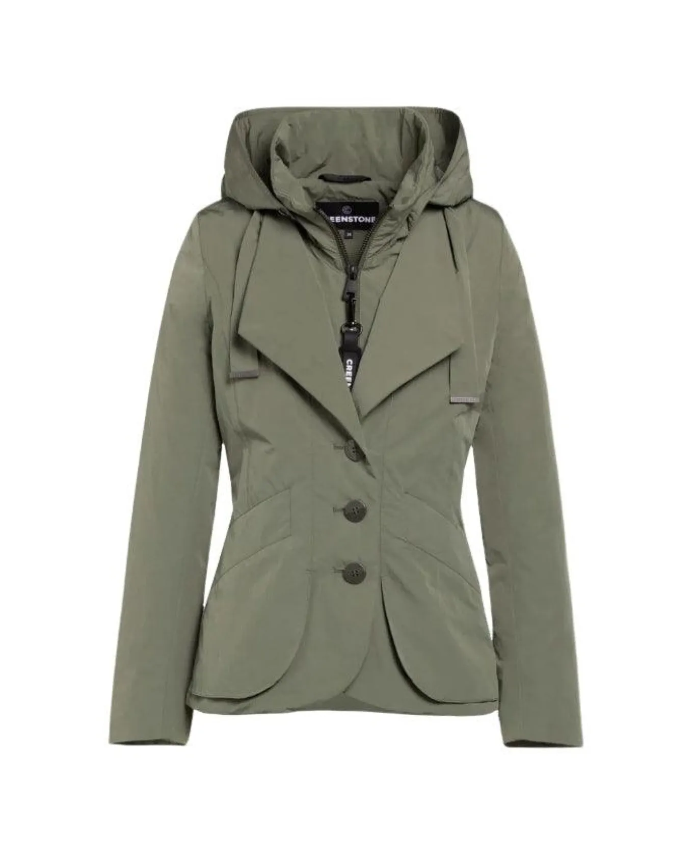 Creenstone casual chic cotton blend blazer jacket with a double closing feature, a two way sleek metal-look zipper on the inside and three classic buttons on the outside, souffle pockets and hood folds in the collar with fabric straps, logo printed lining, water repellent, Length 65cm