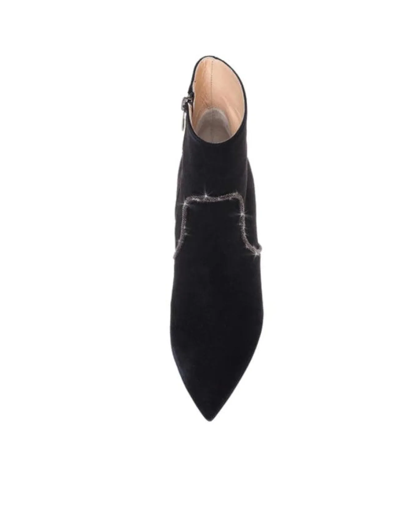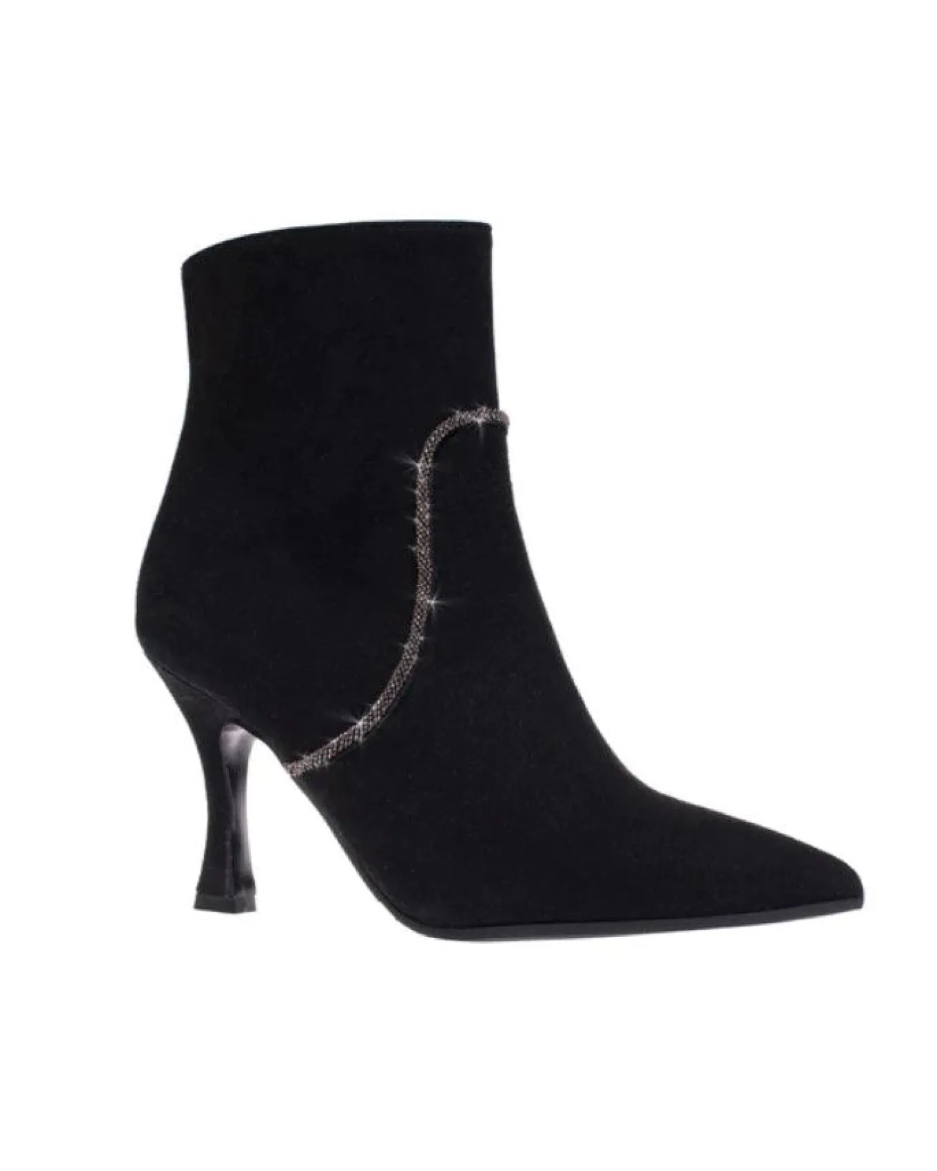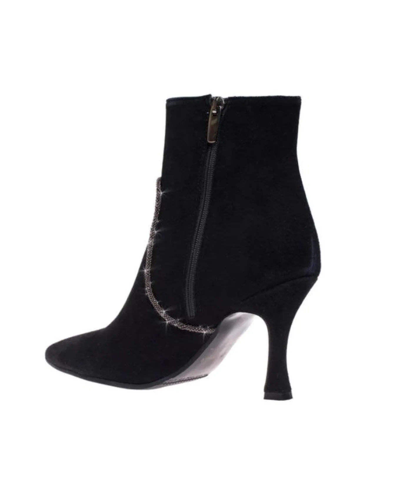 Weatherproof cashmere suede ankle boot with inside zipper, pointed toe, beaded strand detail, 3 1/4″ heel and anti-slip rubber sole