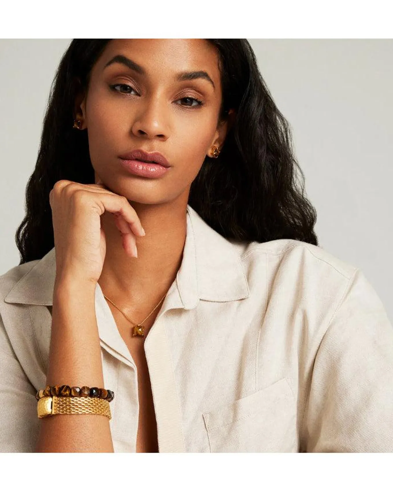 Material: DD Signature Brushed 22-Karat Gold Plated Over High-Quality Brass. Gemstone: Tiger’s Eye