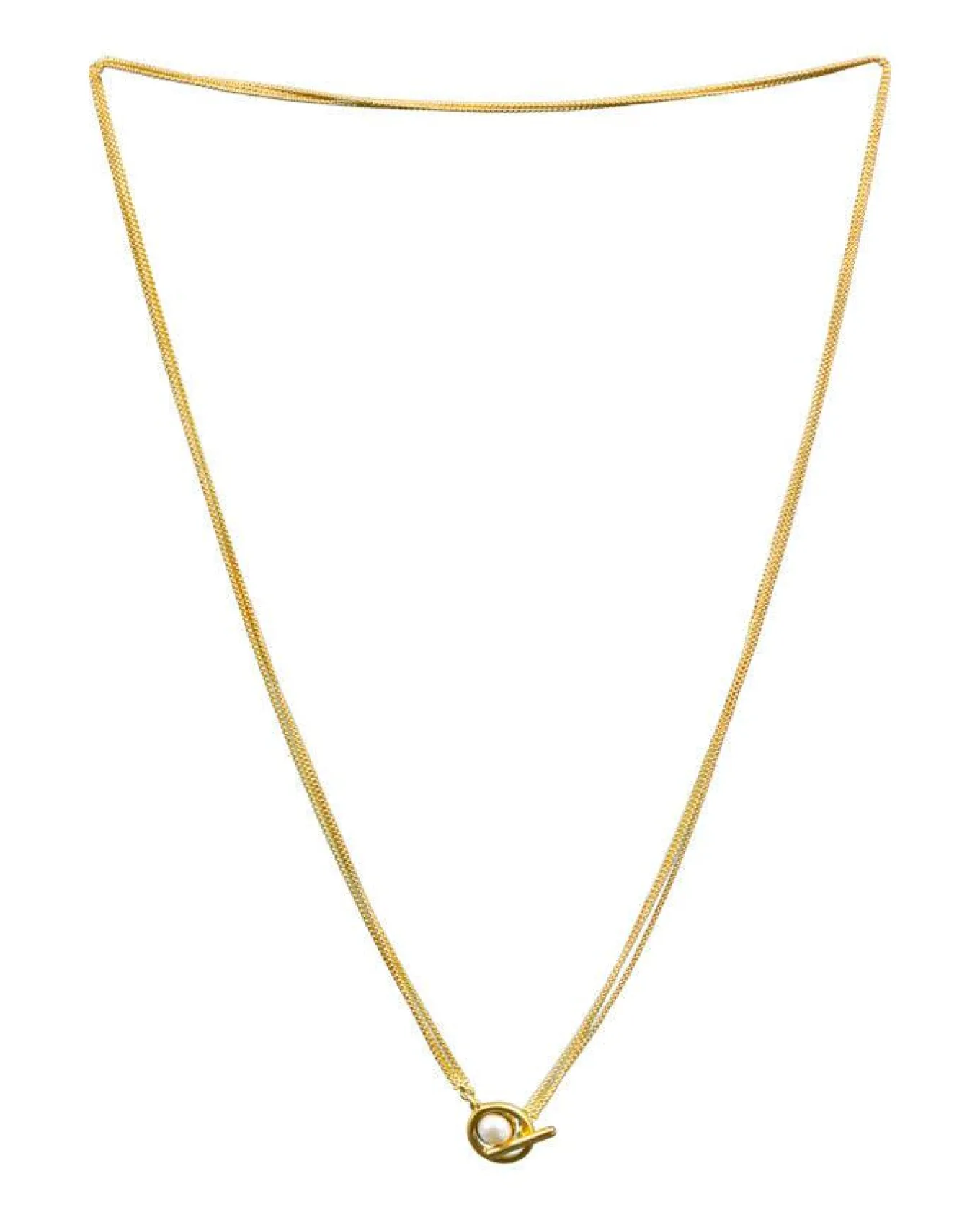 Dean Davidson layered statement pendant necklace features a genuine pearl surrounded by a thin gold outline and suspended on a four strand chain and toggle closure.