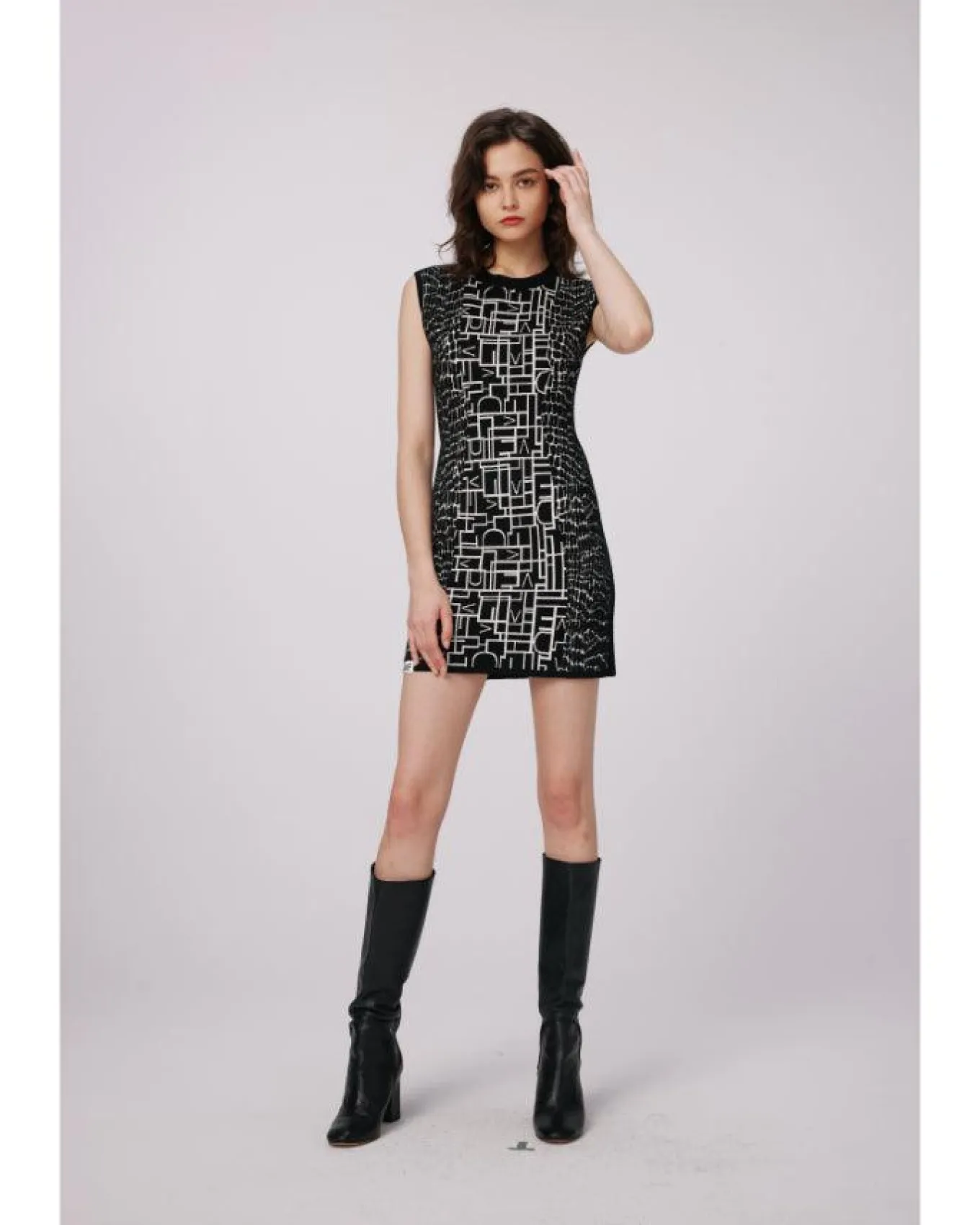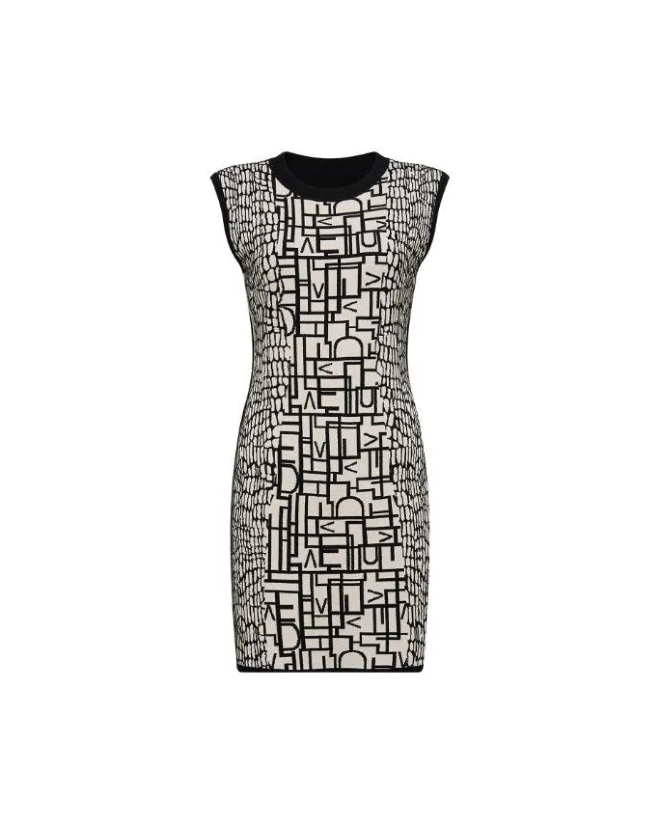 Diane Von Furstenberg close fit knit REVERSIBLE sleeveless mini dress with crew neck features a logo print front, leopard print sides and solid back.