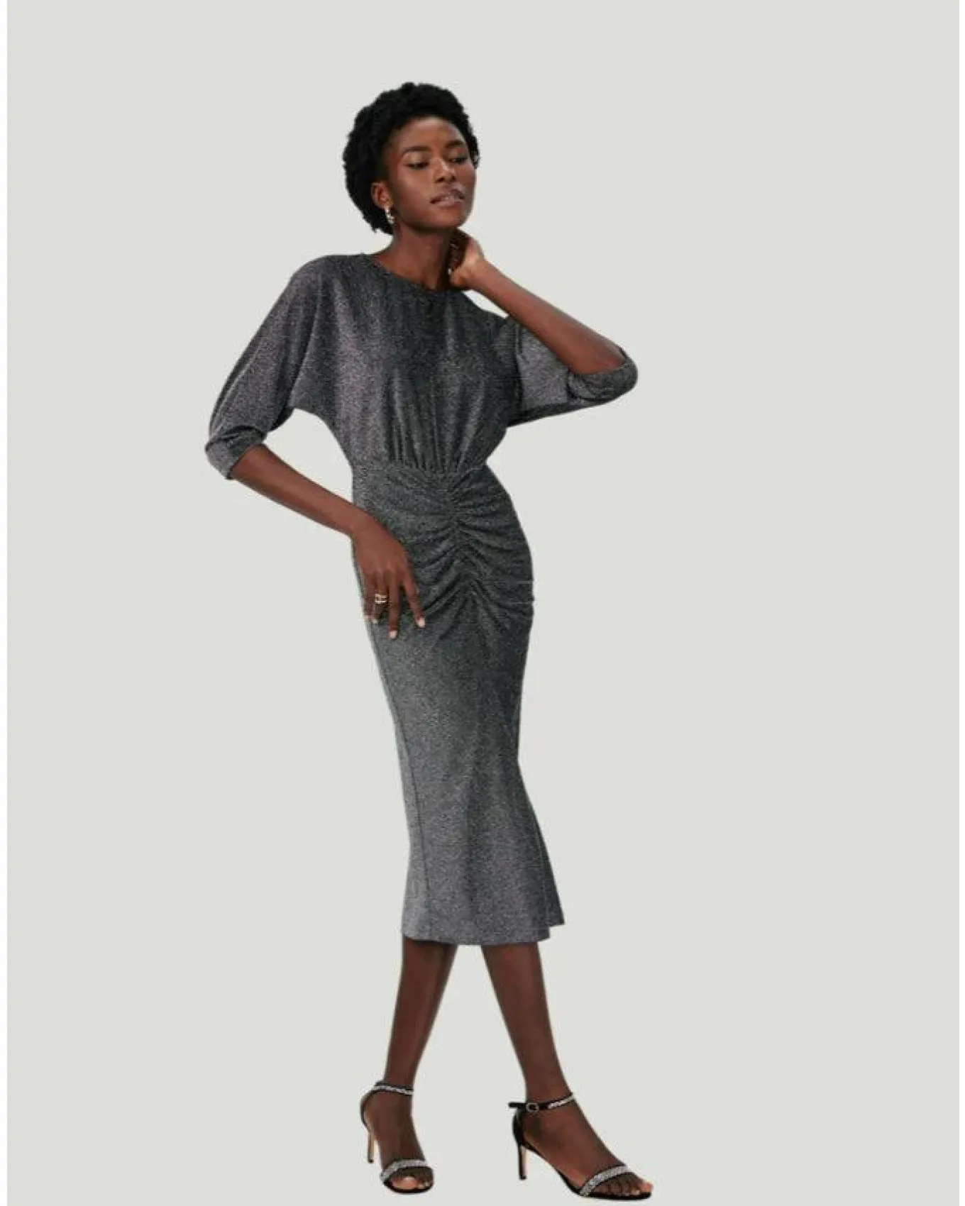 Diane Von Furstenberg striking sparkly metallic jersey midi dress with crew neck, three quarter sleeves and centre gathering that draws the eye and accentuates form.