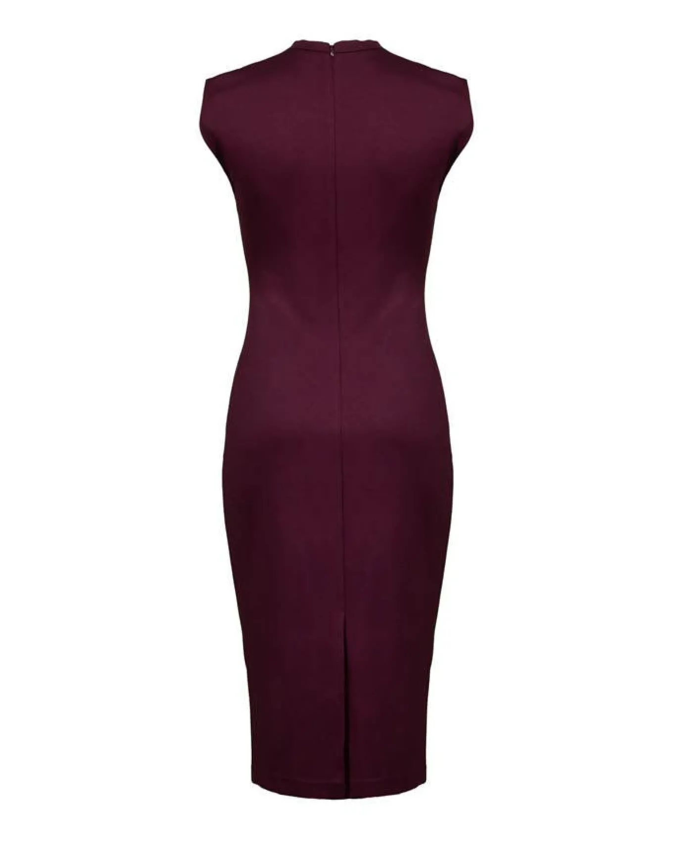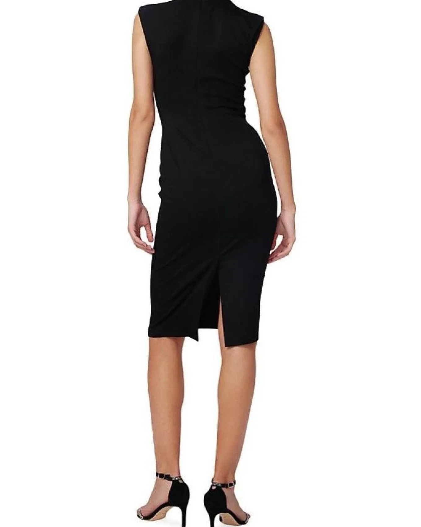 Diane Von Furstenberg sexy slim fit jersey dress is sleeveless with a high neck, ruching at the waist for that feminine shape, concealed back zip closure and back slit, knee length.