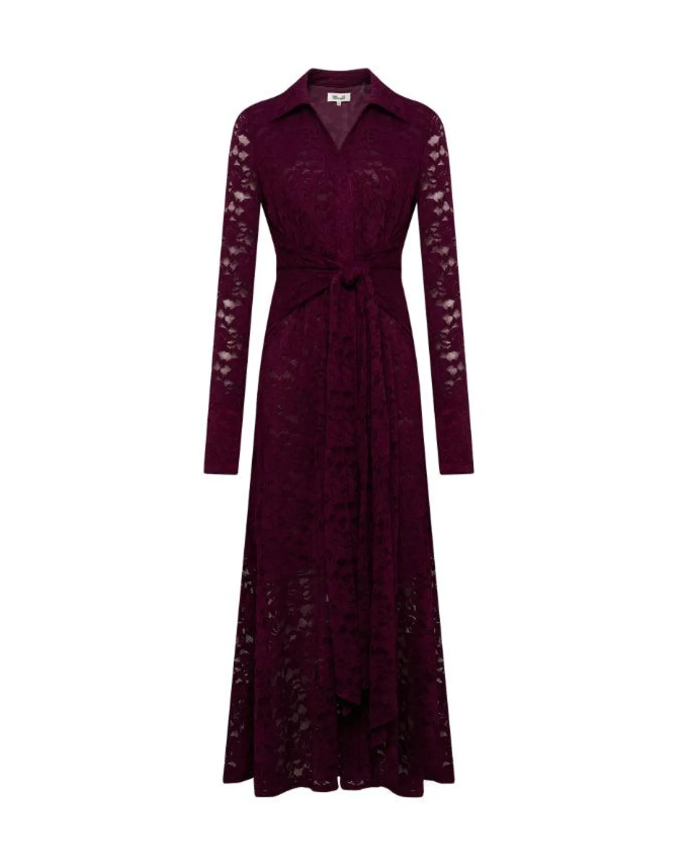 Diane Von Furstenberg exquisite lace midi dress features long sheer sleeves, a classic collar, and a flattering V-neckline, complete with a matching waist-cinching tie.