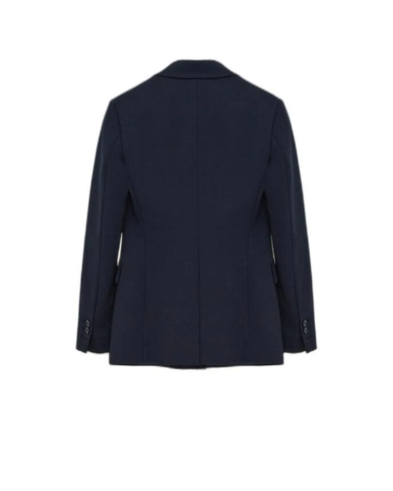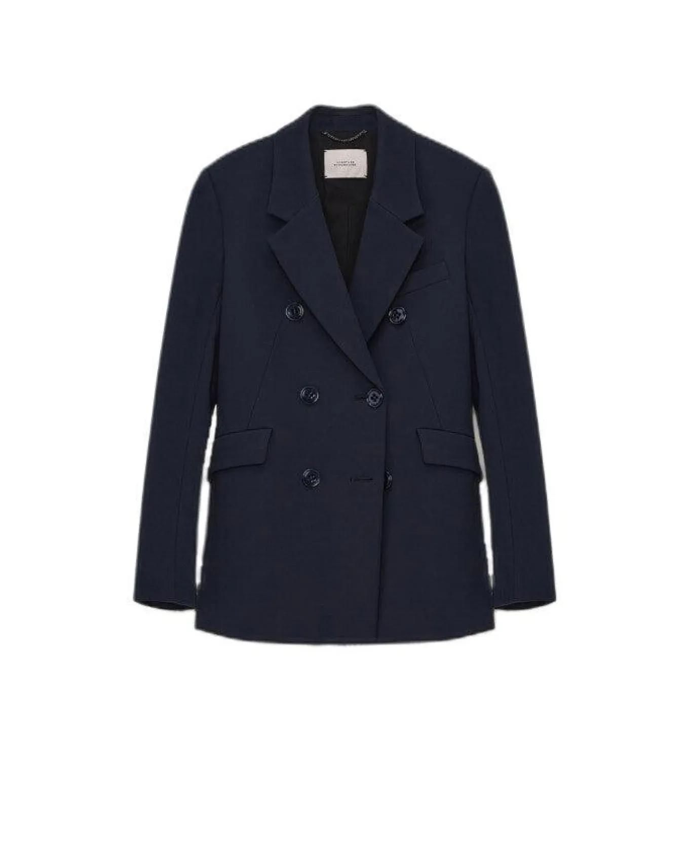 Fitted double breasted blazer with dropped lapel, diagonal darts at the bust, check pocket, button closure, side flap pockets, falls to the hip