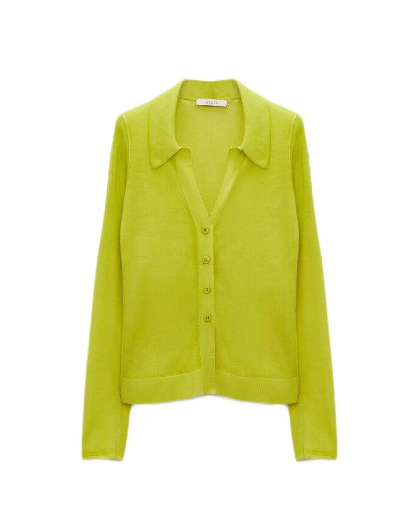 Fitted lightweight wool blend open collar sweater with a buttoned front and rolled trim on cuffs