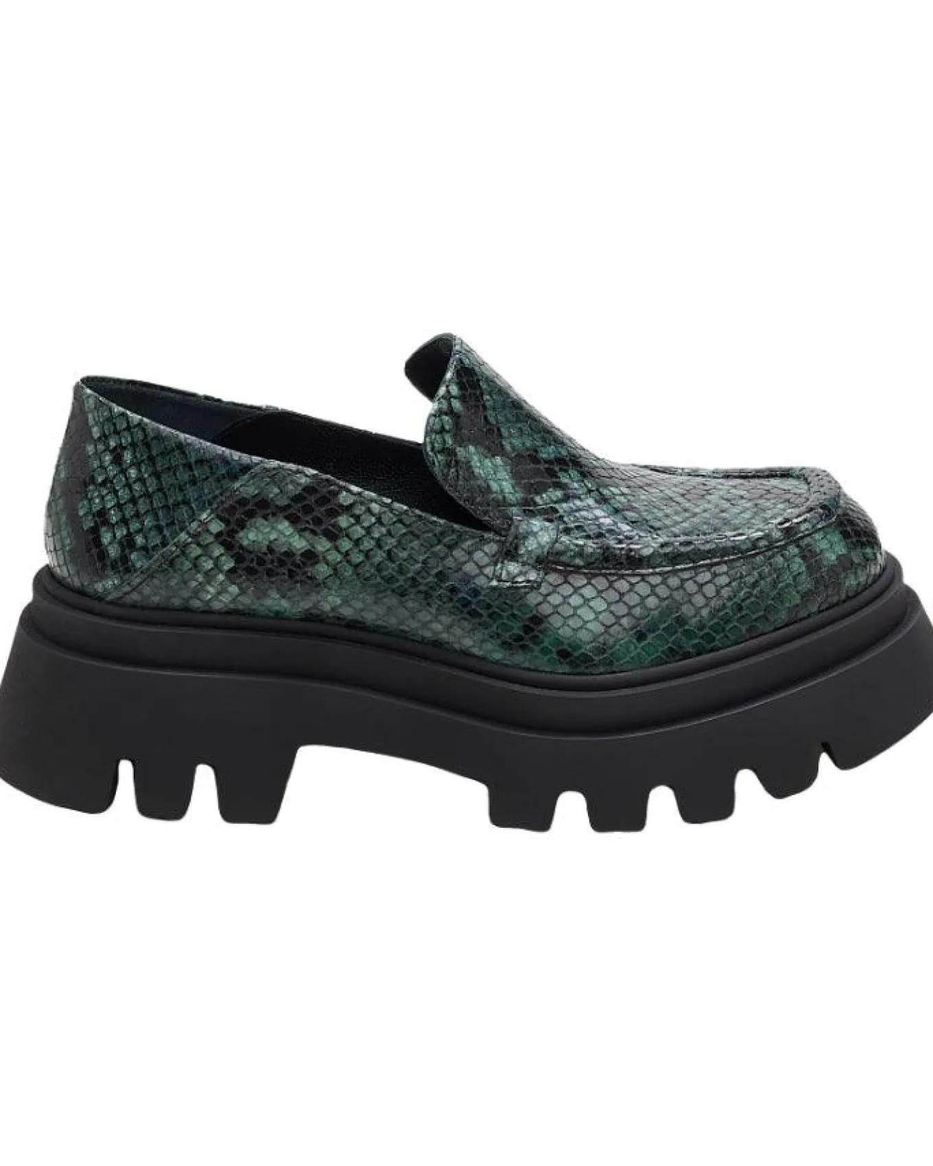 Snake print leather slip on loafer with a platform lug rubber sole