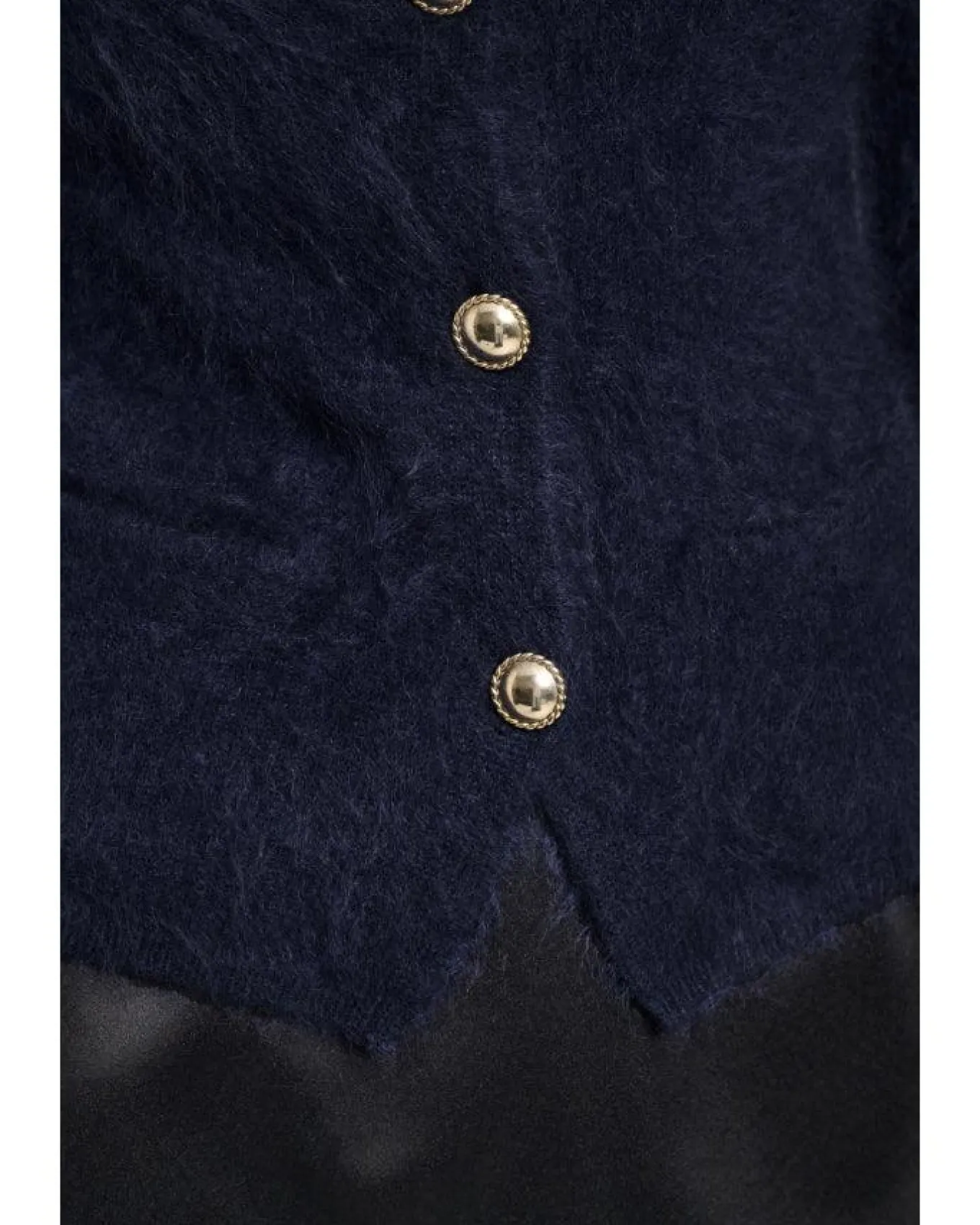 Dorothee Schumacher extra soft fluffy knit blazer style cardigan with notched lapel, small slit pockets, gold tone button front, shoulder pads and a fitted, cropped style.