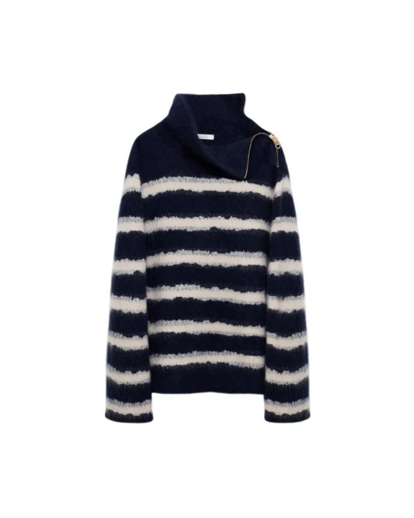 Dorothee Schumacher extra soft fluffy knit striped turtleneck. The wool-cashmere style has a gold-tone zip on the shoulder with mixed texture D-ring hardware thatcan be unzipped and worn off-the-shoulder.