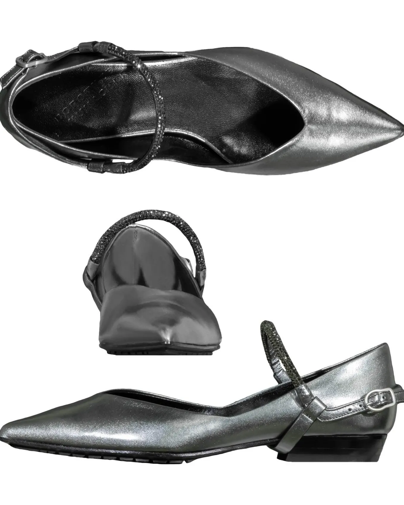 Super soft sheepskin and goat leather shoe with metallic finish, sporty leather sole with a rubber tread, can be worn with or without the detachable glitter harness strap