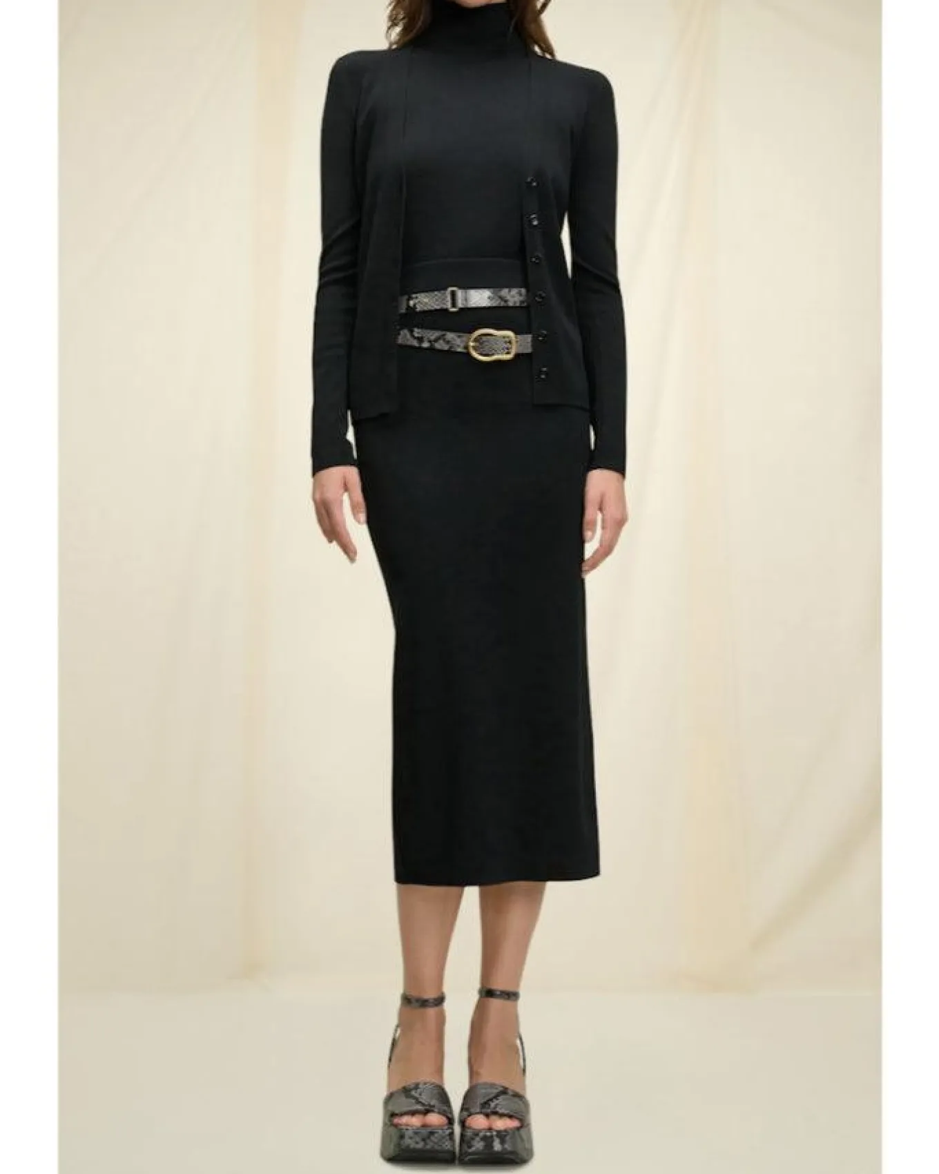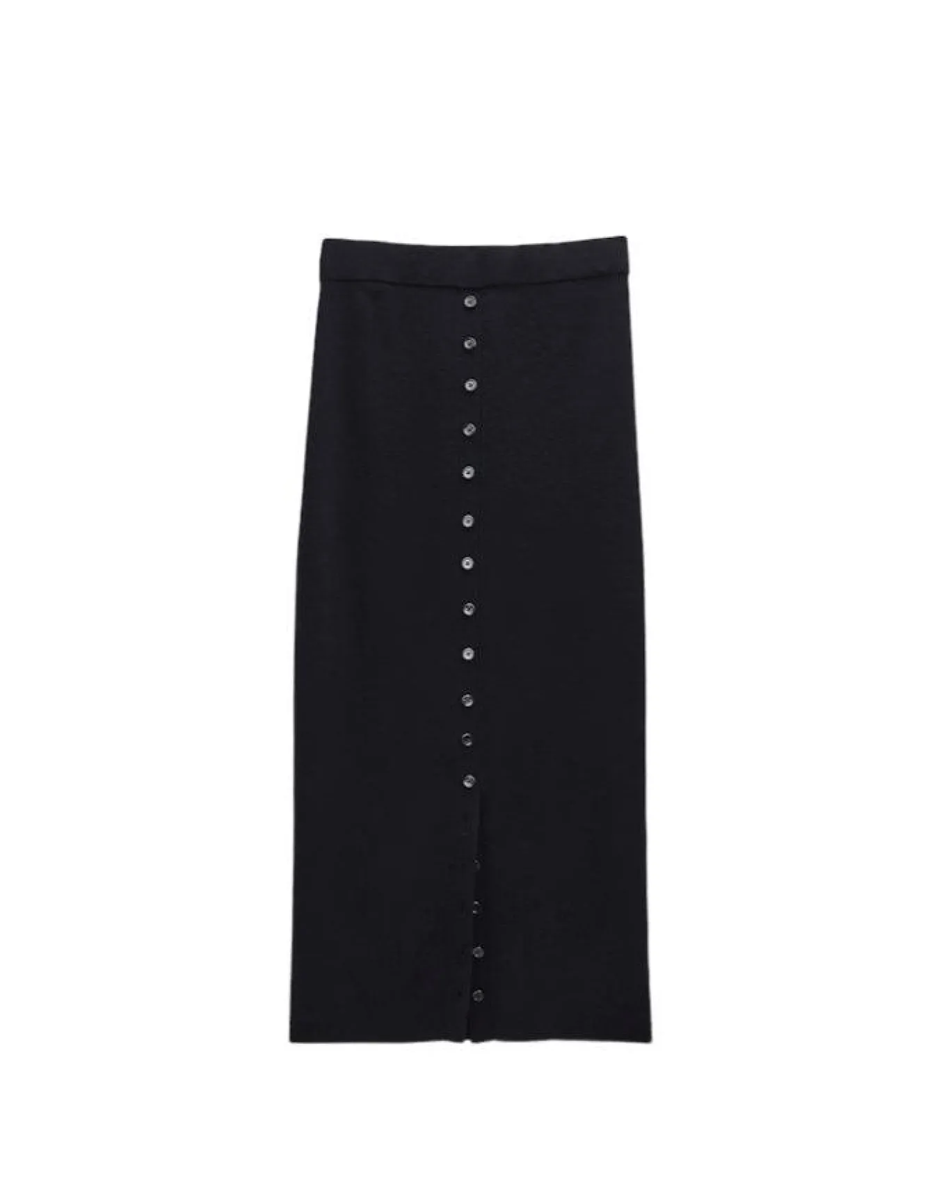 Fitted, straight silhouette lightweight merino blend midi skirt with a rear button placket which only opens below the knees to the hem.