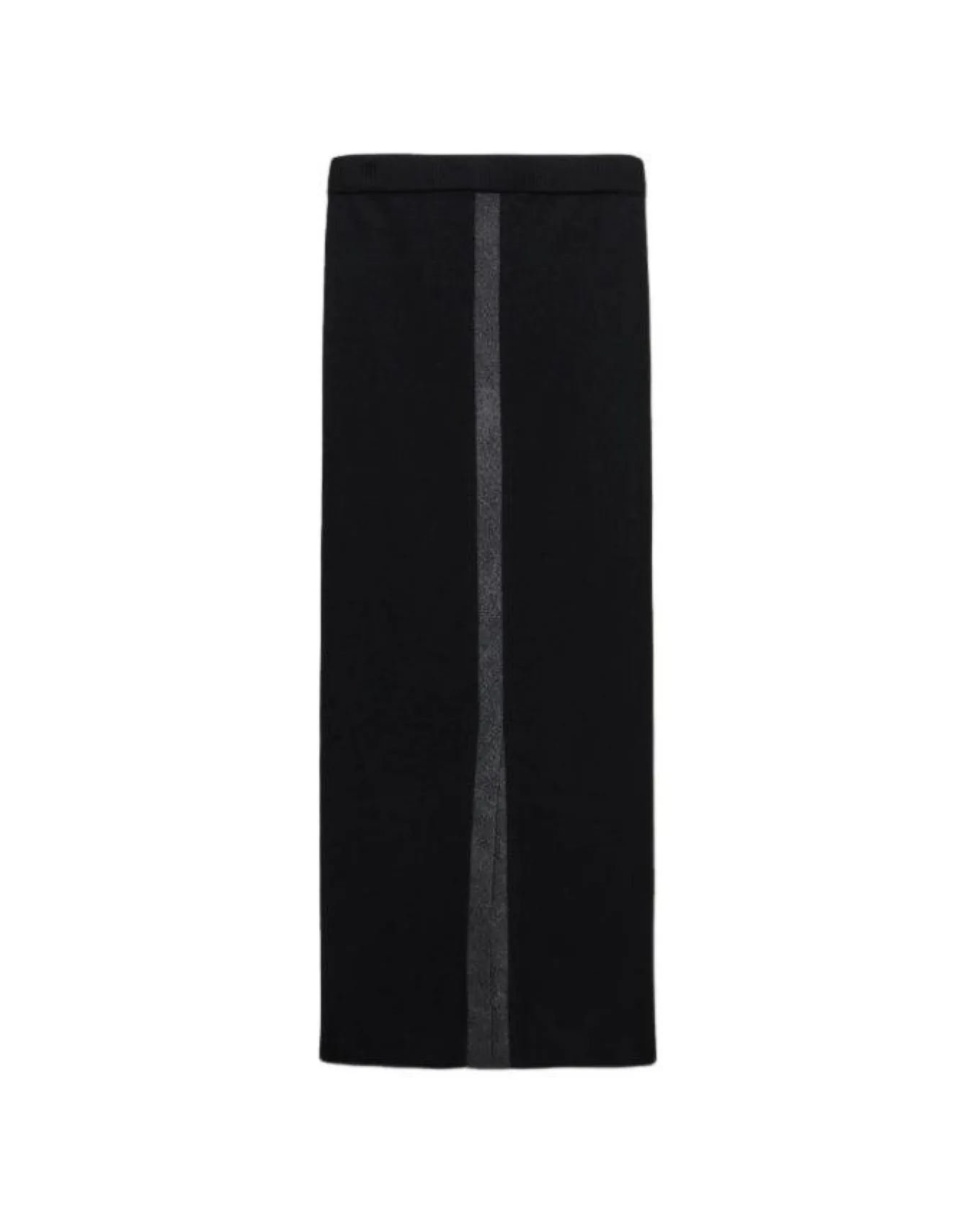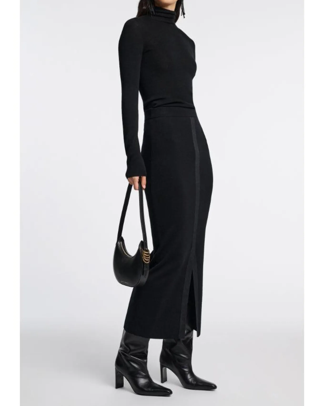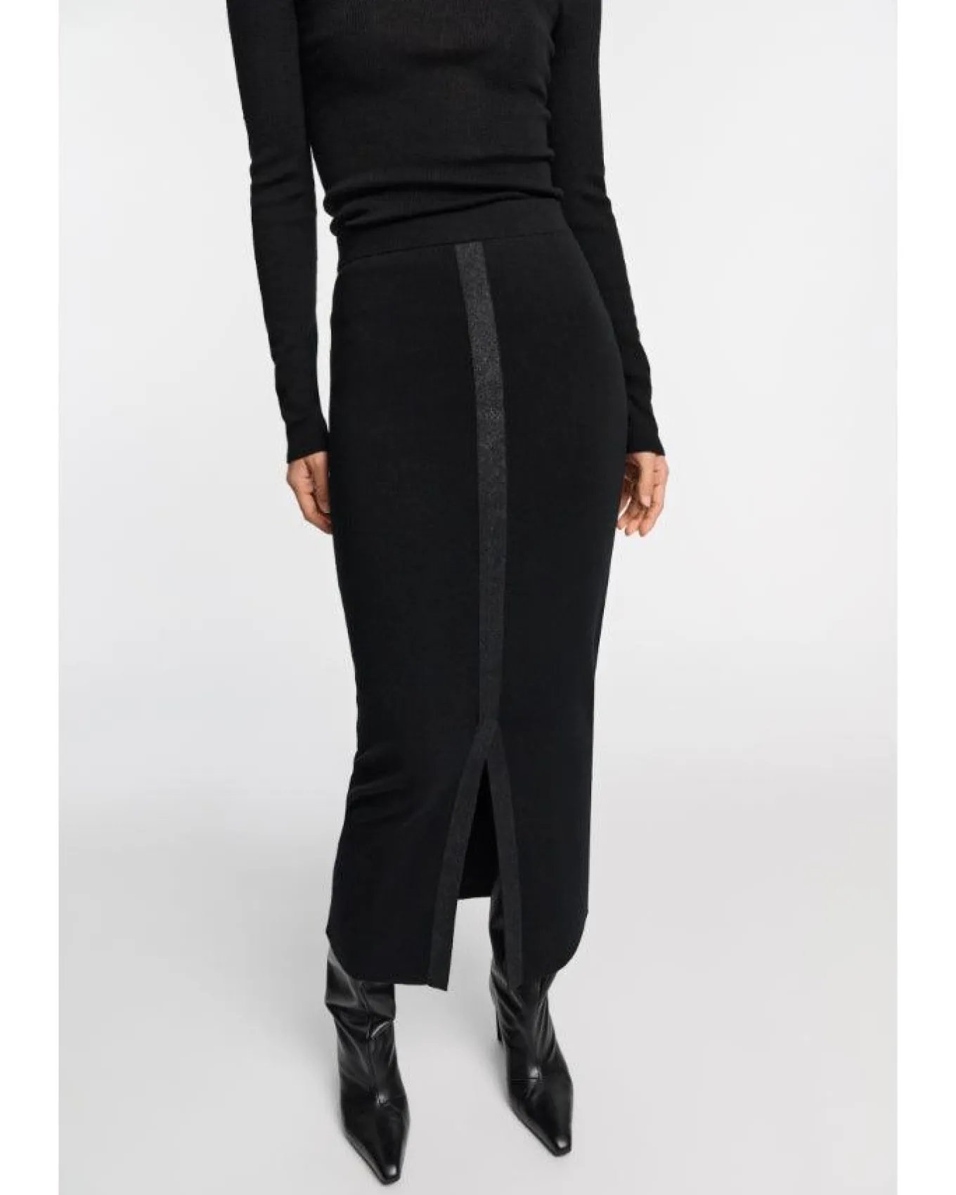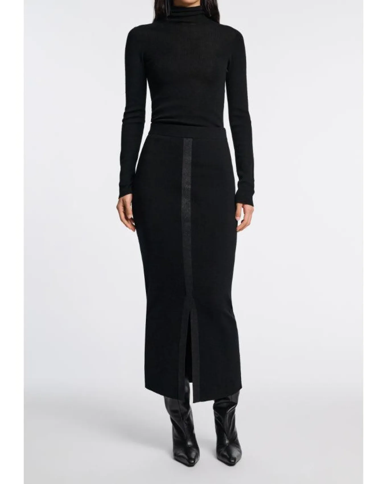 Dorothee Schumacher fitted, long straight cut stretchy merino wool mix skirt with elastic waistband, front slit from knee to hem and shimmering tonal metallic foil trim.