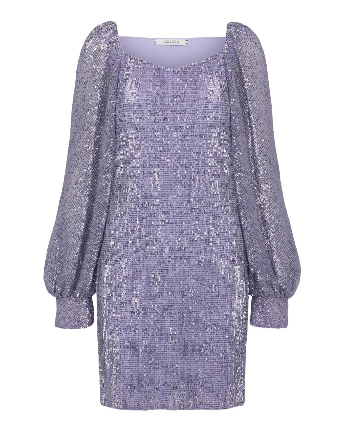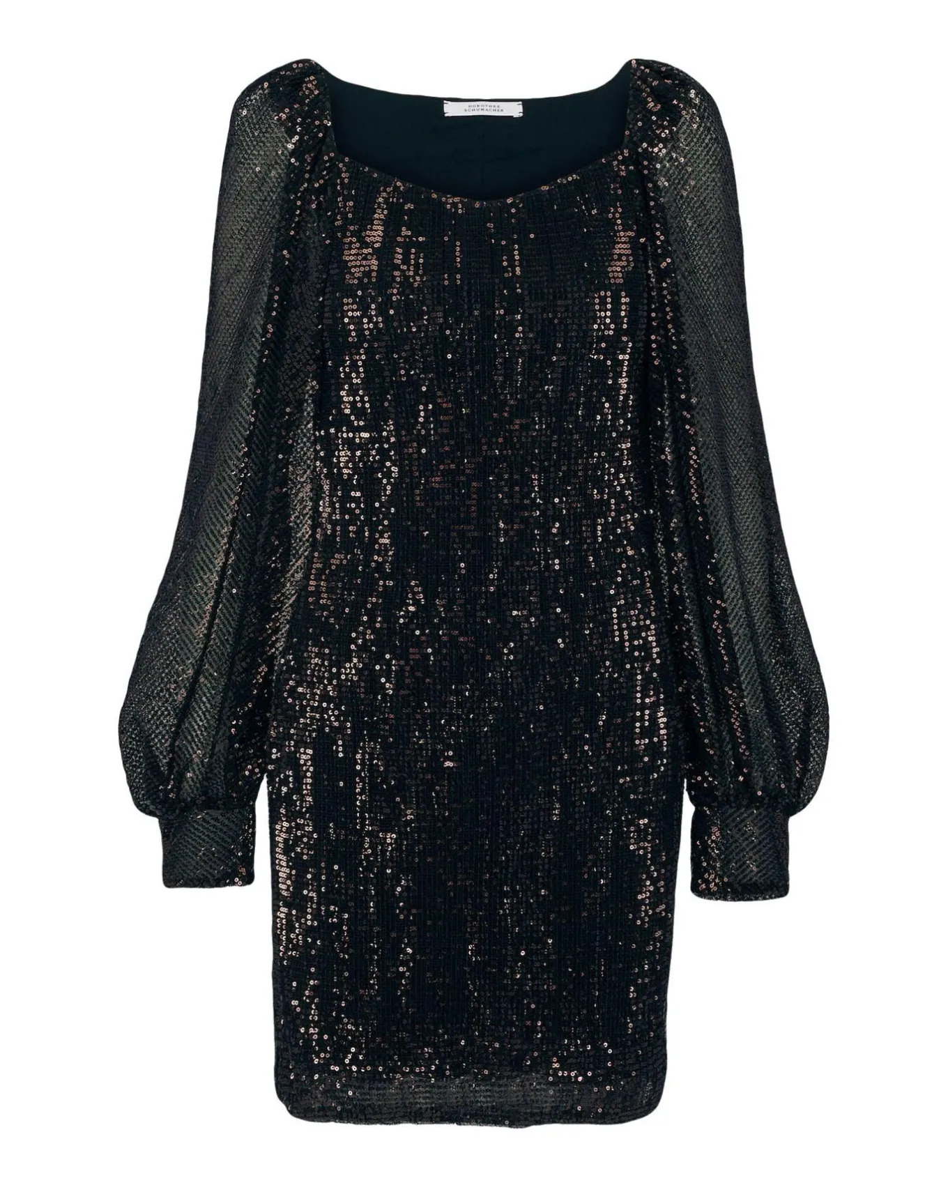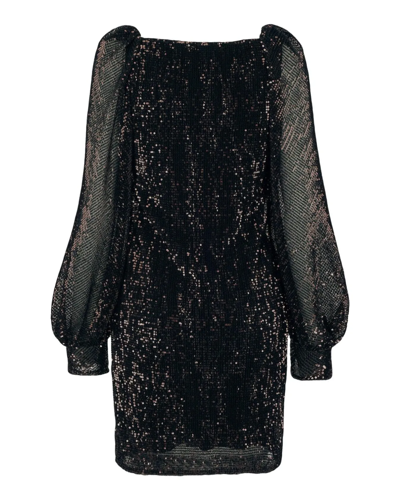 Stretchy sequin embellished mini dress features a square neckline with a slight V shape, blouse style long sleeves with a bias cut and gathered at the shoulders