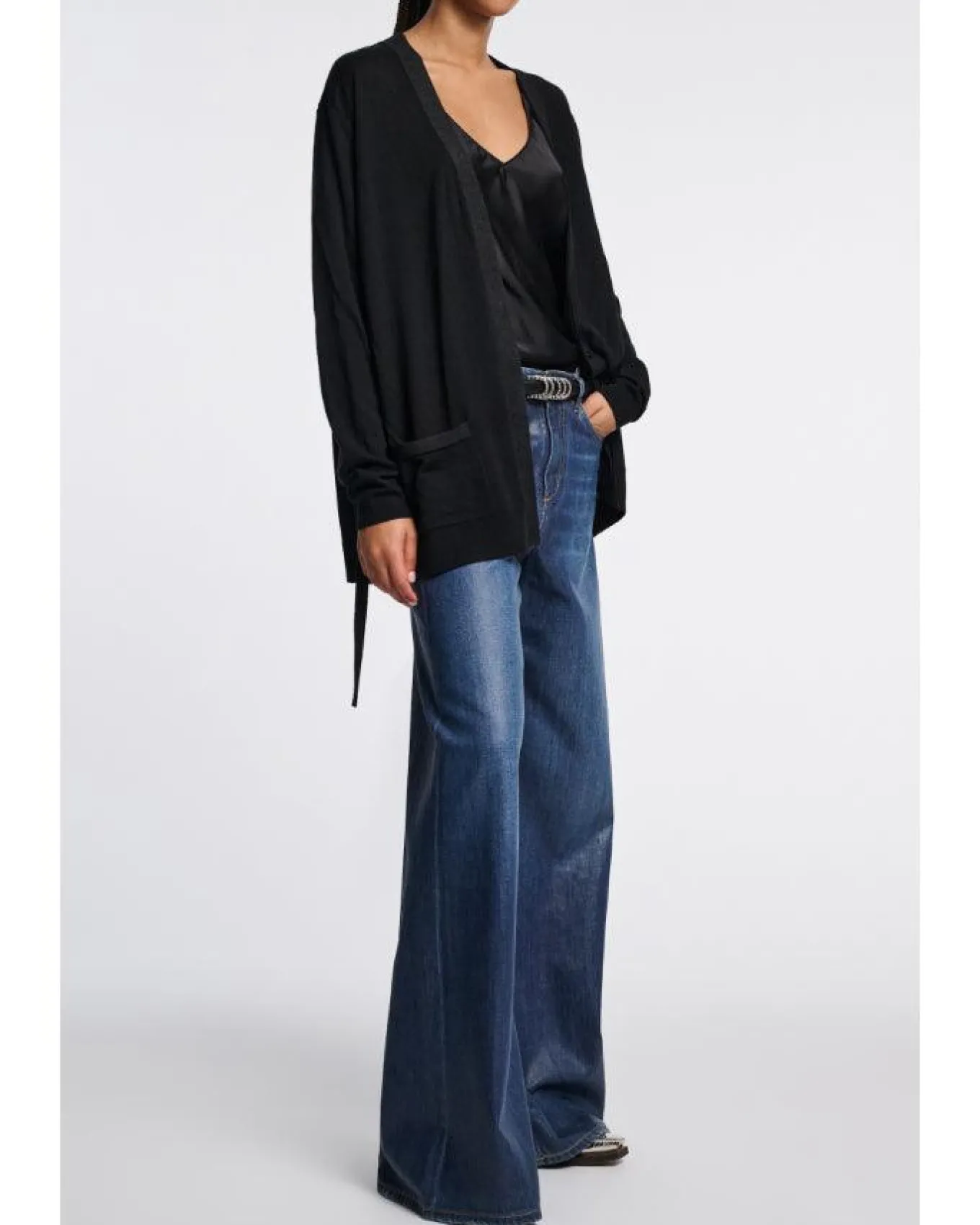 Dorothee Schumacher generous fit, knit merino wool v-neck cardigan with tonal metallic foil trim and pocket detailing, concealed button placket, hip length, dropped shoulders and fitted cuffs. The longer silhouette has a self-tie sash attached to the side seams which can be bound at the front or back.