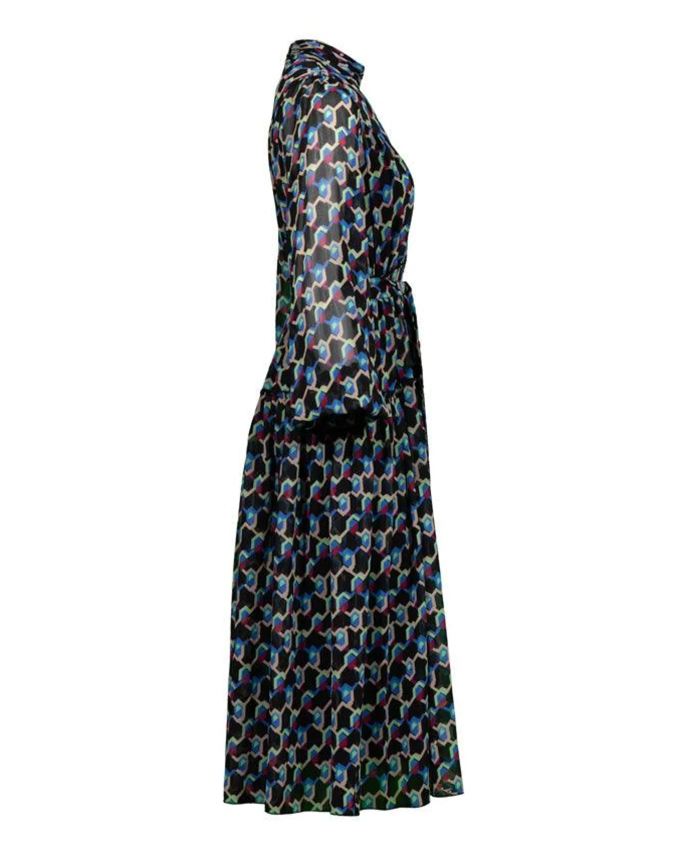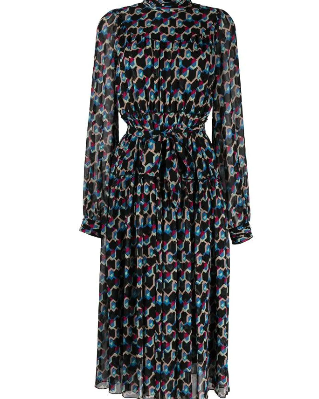 Diane Von Furstenberg dress in soft chiffon geo illusion print, midi dress with a high collar, sheer long sleeves button cuff, semi-sheer overlay, a full flowy skirt with a belt that ties at waist and concealed rear hook and zip closure.