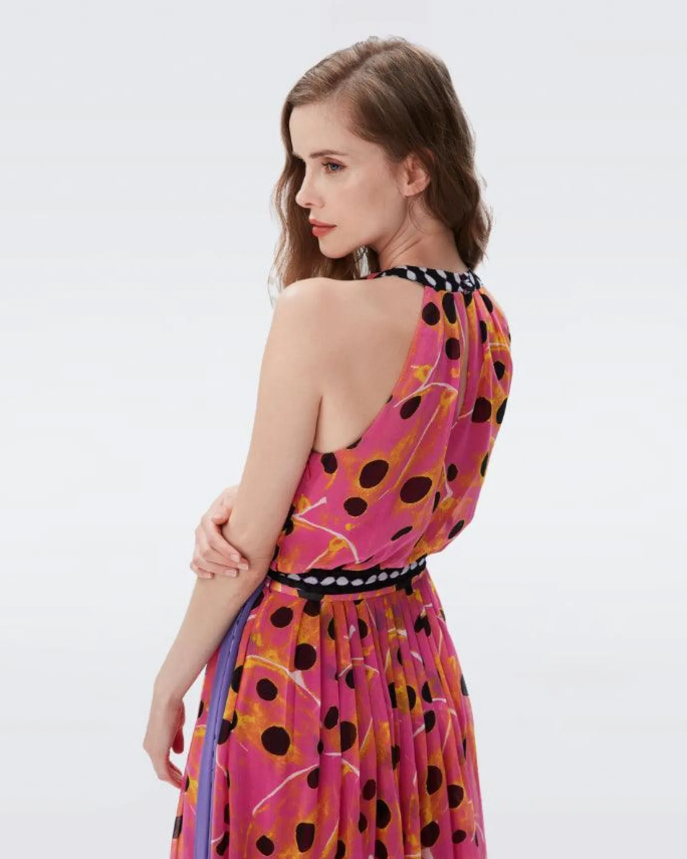Romantically draped soft chiffon dot print dress features a pleated halter neck with cut-out detail, a contrasting belt accentuates the waist and pleated details continue into its full maxi skirt